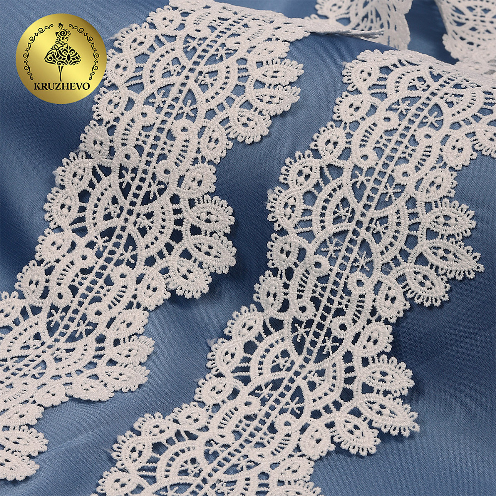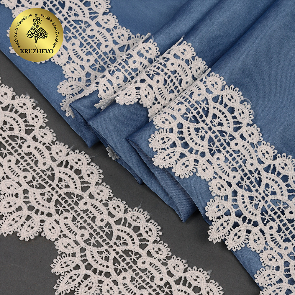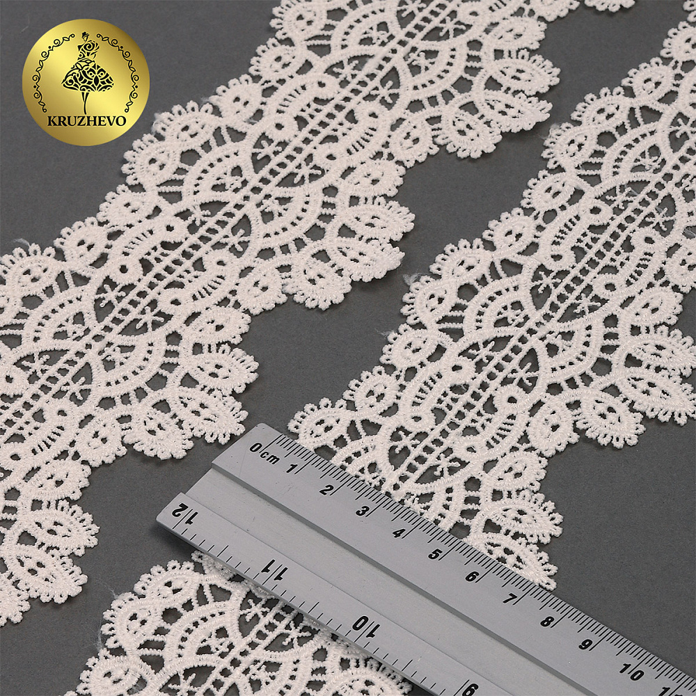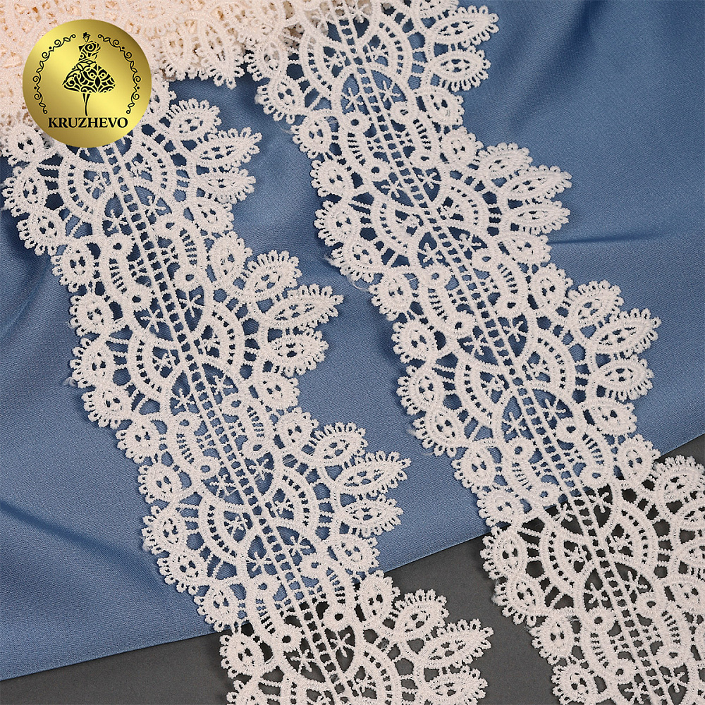 Красивое, ажурное гипюровое кружево от бренда Kruzhevo. Мягкое, но при этом очень прочное за счет полиэстеровых нитей. Хорошо держит форму. Имеет широкую область применения: начиная от одежды, школьной формы и свадебных нарядов, заканчивая декором интерьера.