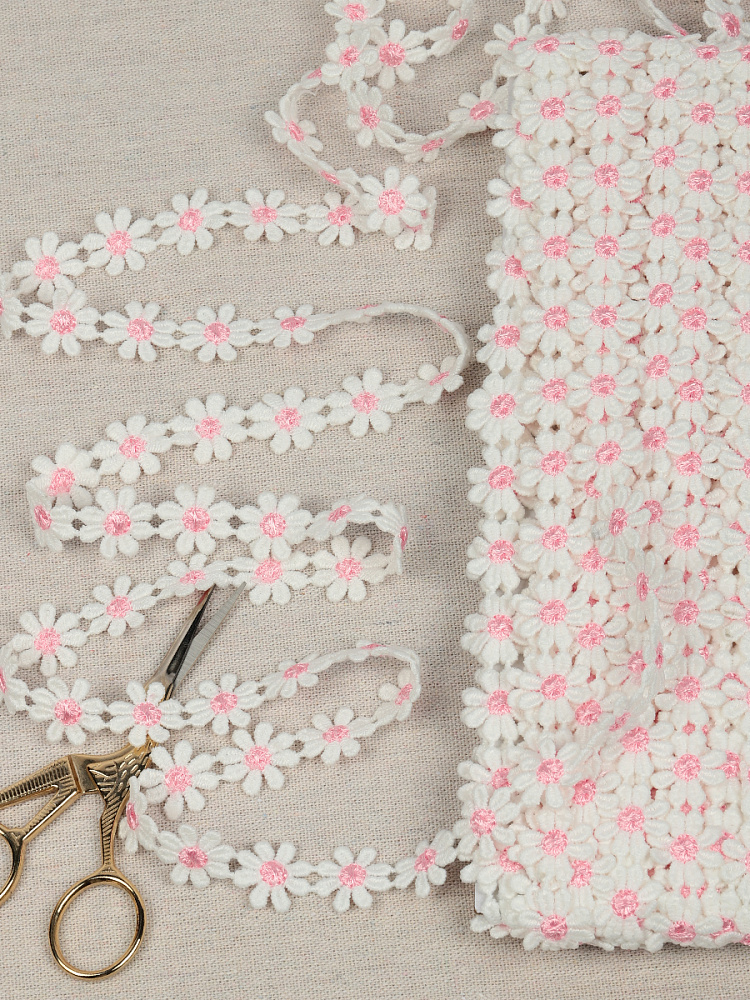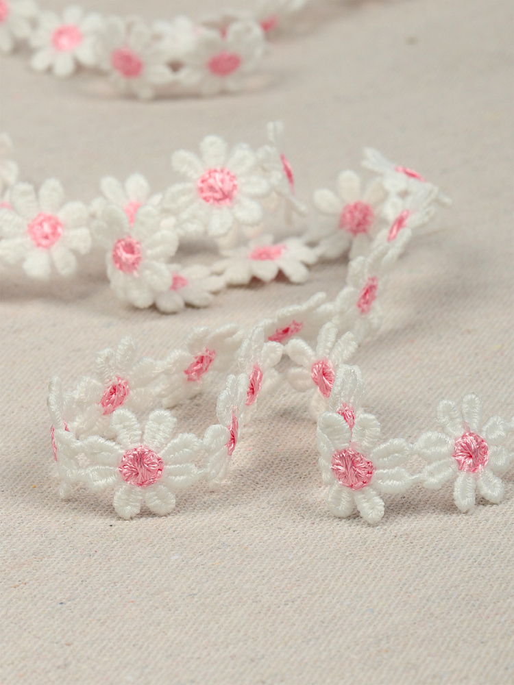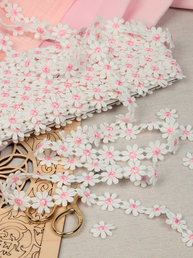 Кружево гипюр (плетёное) ромашка 15 мм / 13.71 метра, TBY.12243/1, цв.белый+розовый, Kruzhevo