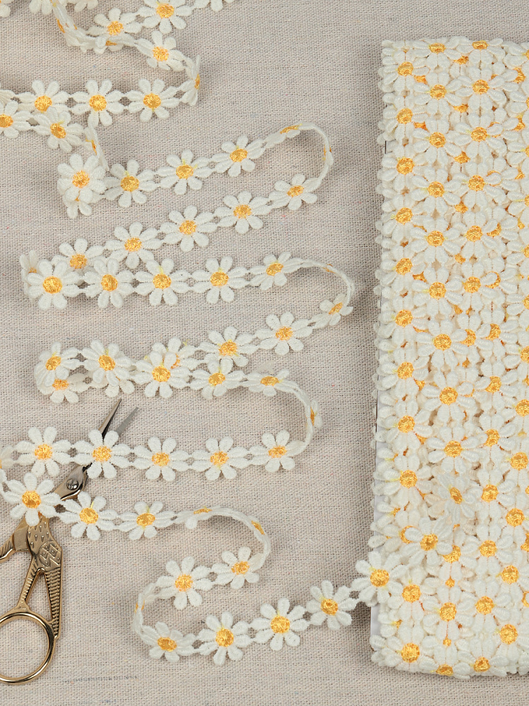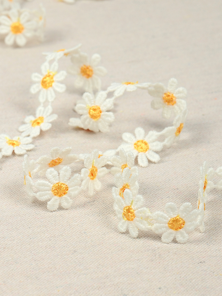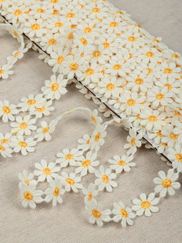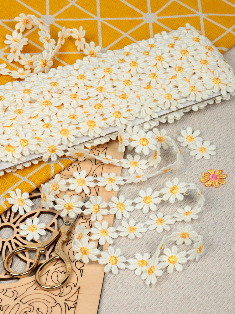 Кружево гипюр в виде ромашек. Отлично держит форму, при этом является достаточно гибким и удобным в работе. Имеет элегантный блеск. Подойдёт для отделки и украшения текстильных изделий, одежды и аксессуаров.