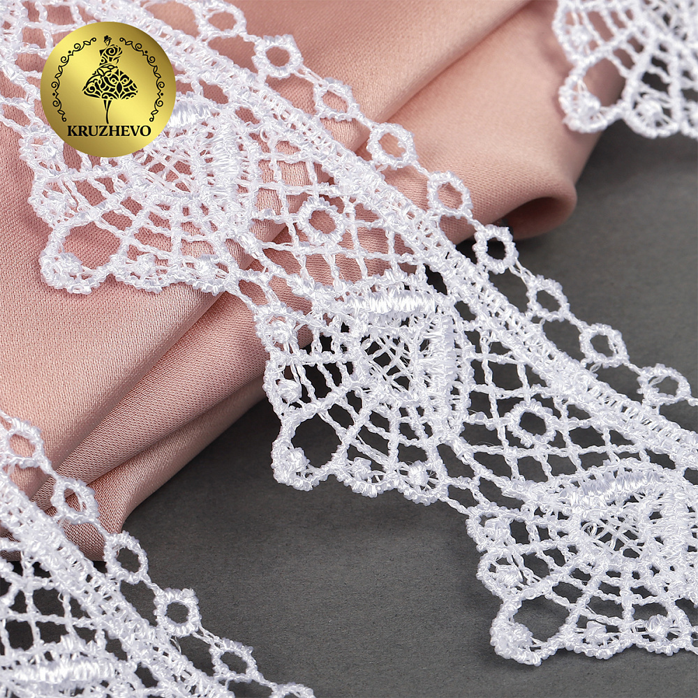 Легкое, ажурное кружево гипюр. Мягкое, но при этом очень прочное за счет полиэстеровых нитей. Имеет благородный блеск. Хорошо держит форму. Имеет широкую область применения: начиная от одежды и свадебных нарядов, заканчивая декором интерьера.