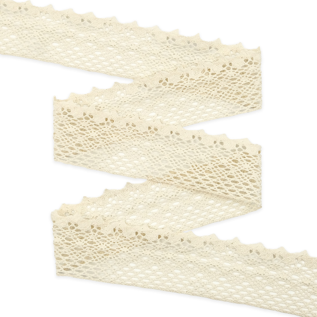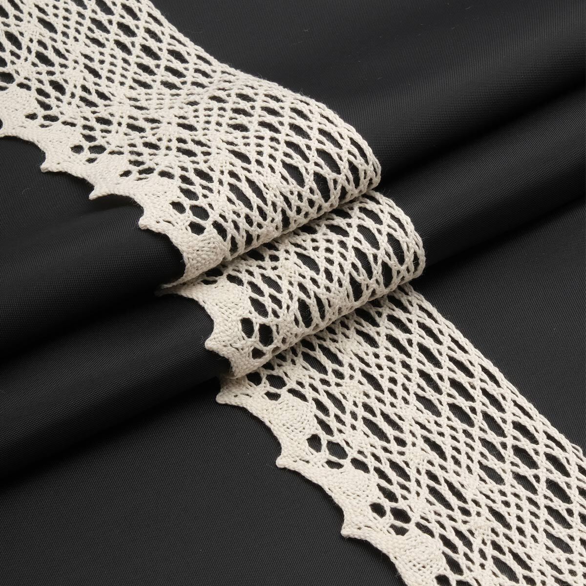 Хлопковое сетчатое кружево – традиционный отделочный материал. Кружево из натурального хлопка особенно выгодно смотрится на натуральных тканях, таких как хлопок, лен, бамбуковое волокно, вискоза. Пришивается к краю изделия с помощью простой машинной строчки. Применение: – отделка одежды, нижнего белья; – украшение домашнего текстиля – скатертей, салфеток, штор; – изготовление брошей, заколок и других авторских украшений; – оформление альбомов, фоторамок в технике скрапбукинга. Вещи, отделанные кружевом, создают впечатление уюта и романтики. Подходит для стилей кантри, шебби-шик. Размер: ширина 55 мм, длина 25 м.