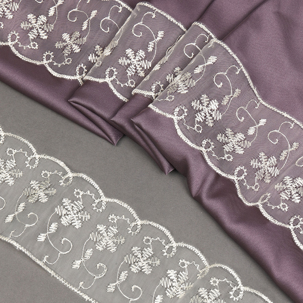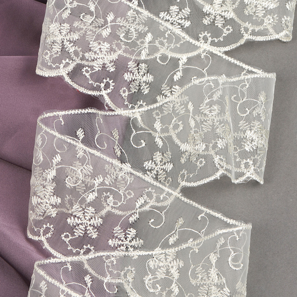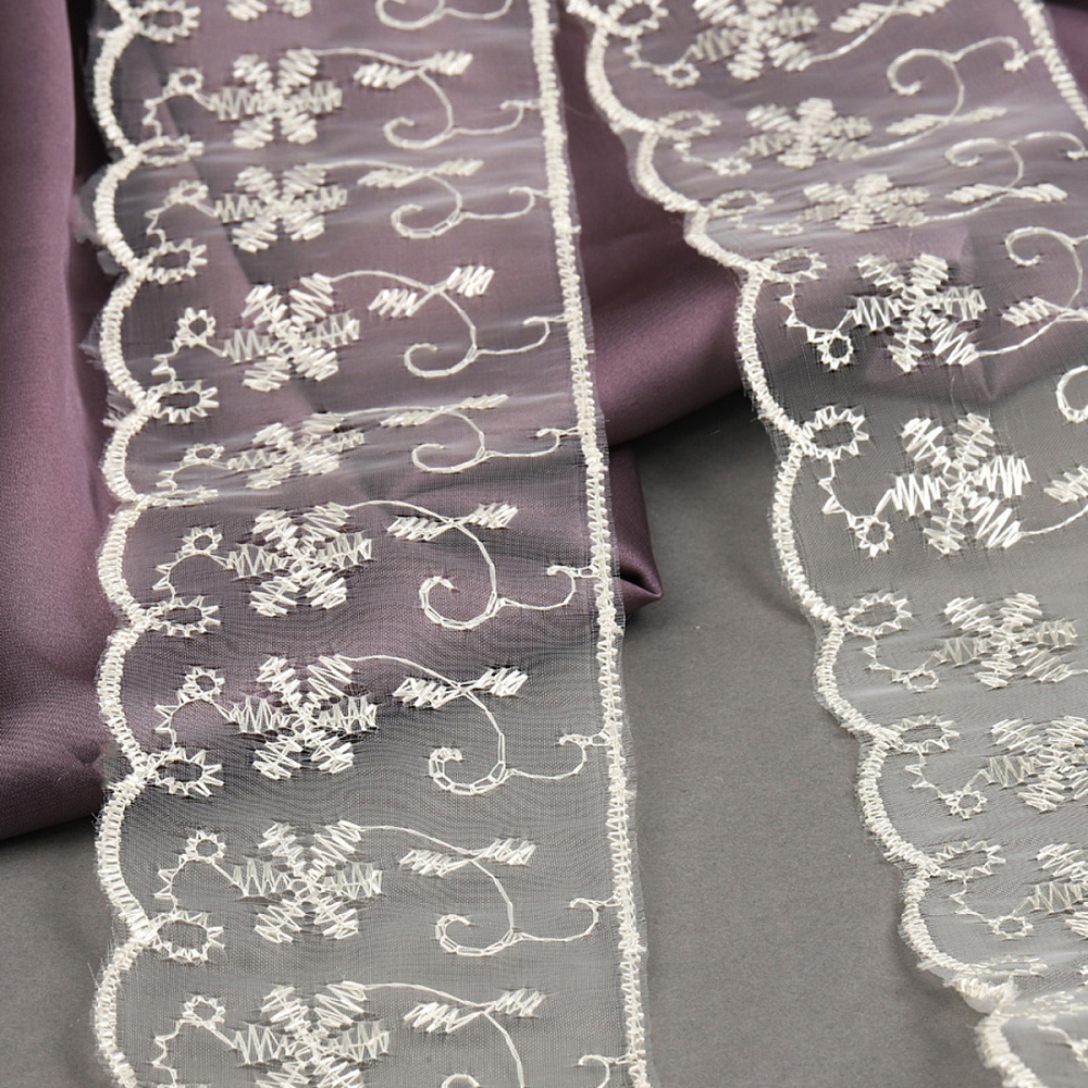 Роскошное кружево из капроновой нити. Оно не сминается и не растягивается, что обеспечивает роскошный вид на протяжении всего срока службы готового изделия, а прекрасный мотив полотна, выполненный в изящном стиле с извилистыми и плавными очертаниями рисунка, позволит придать шарма любому образу, который Вы пожелаете создать. Кружево из капрона используется для пошива и декора одежды, белья, декоративных изделий и предметов интерьера, оформления подарков, изготовления бижутерии.