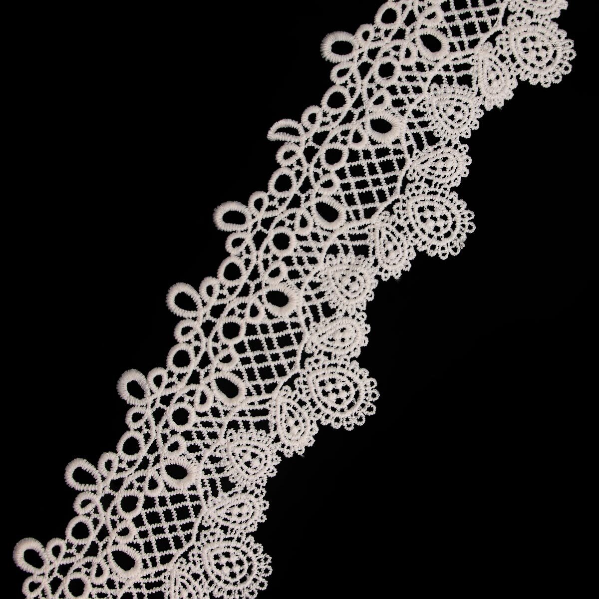Гипюр – сцепной вид кружева, его легко узнать по слегка объемным узорам на тонкой сетке. Гипюр принято использовать отделки праздничной одежды, нижнего белья, а также домашнего текстиля – штор, скатертей, накидок. Матовое кружево удачно сочетается различными видами тканей, например, атласом, сатином или тонким трикотажем. Материал: 100% полиэстер. Размер: ширина 95 мм, длина 9,14 м. Рекомендации по уходу: стирать в специальном мешочке с использованием мягких моющих средств. Температура воды – не более 40 градусов Цельсия. Гладить через влажную ткань при температуре до 150 градусов Цельсия.