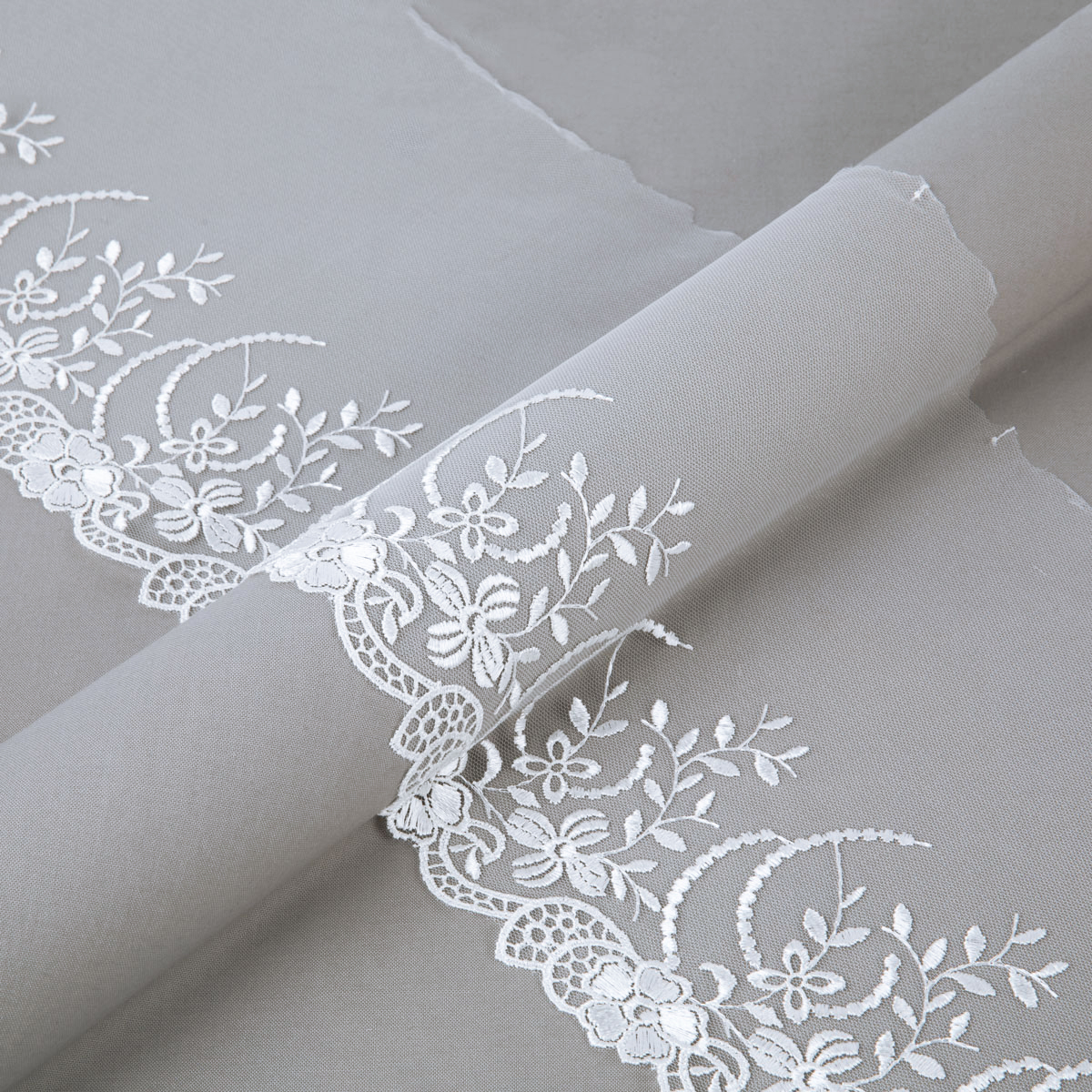 Кружево на сетке представляет собой кружевное полотно, основа которого сетка или фатин. применяется для декоративной отделки лёгкой женской одежды и домашнего текстиля.