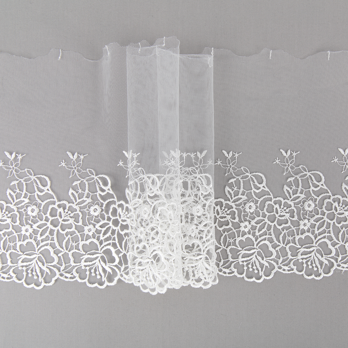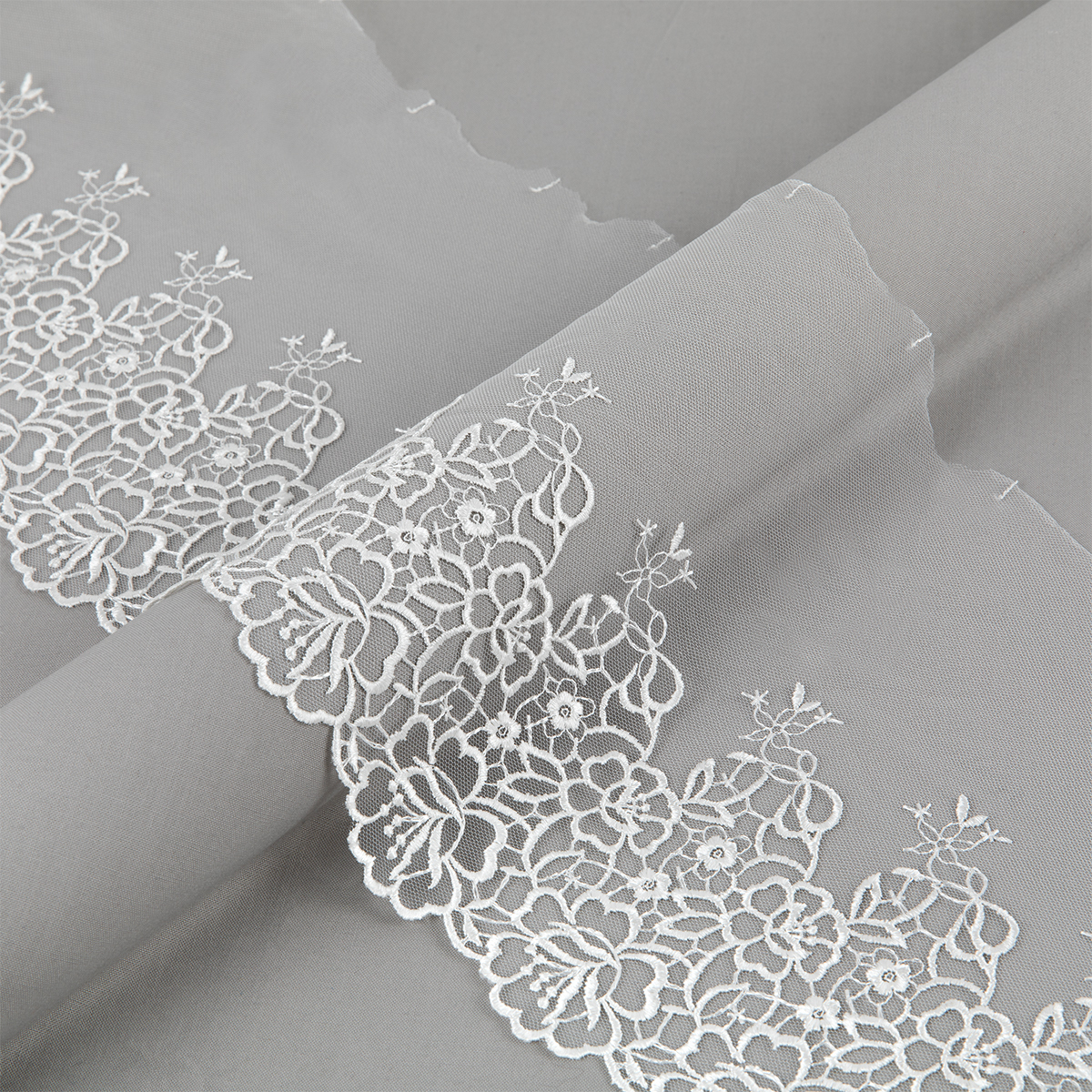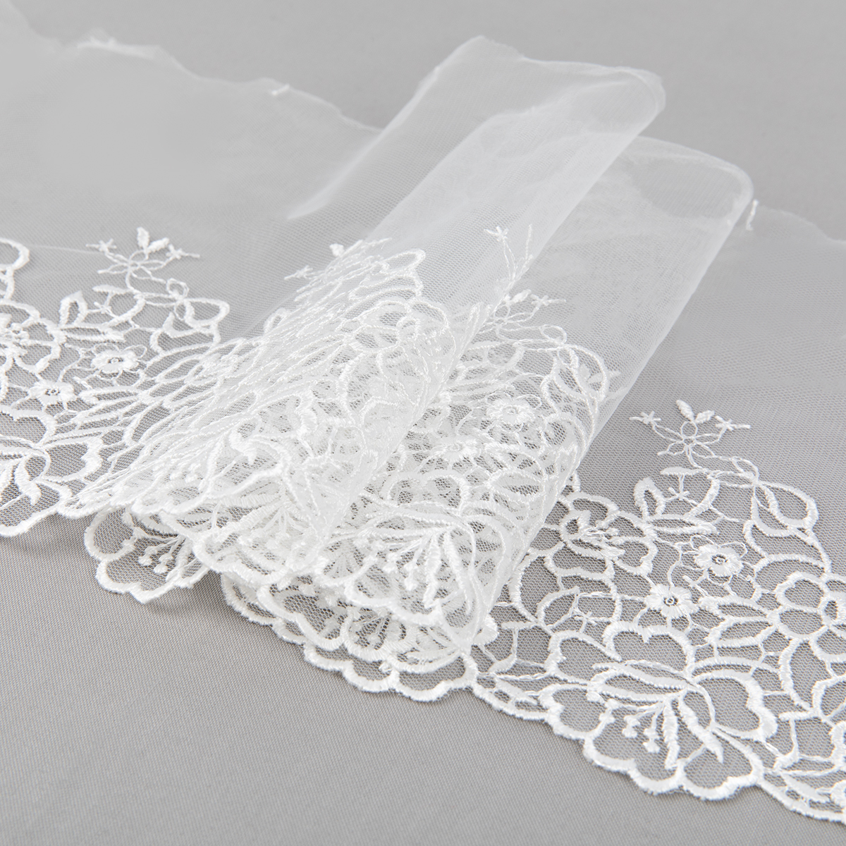 Кружево на сетке представляет собой кружевное полотно, основа которого сетка или фатин. применяется для декоративной отделки лёгкой женской одежды и домашнего текстиля.