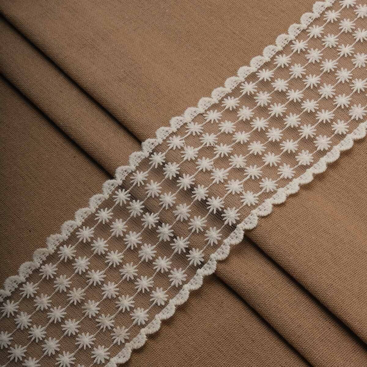 Кружево с вышивкой на сетке – полупрозрачное и тонкое, но при этом хорошо держит форму. Удачно сочетается различными видами тканей: атласом, сатином, бархатом, тонким трикотажем. Вещи, отделанные капроновым кружевом, создают впечатление уюта и романтики. Применение: – отделка нарядной одежды, одежды для выступлений, нижнего белья; – украшение штор, скатертей и другого домашнего текстиля; – оформление подарочной упаковки или блокнотов; – для оригинальных аппликаций; – создание брошей, заколок и других авторских украшений. Рекомендации по уходу: стирка в деликатном режиме при температуре не выше 30 градусов. Используйте специальный мешочек для стирки. Гладить запрещено. Цвет: молочный. Материал: 100% полиэстер. Размер: ширина 8 см, длина 13,7 м.