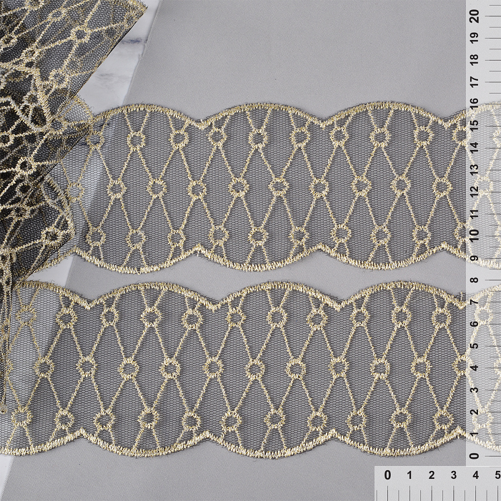 Кружево на сетке 80 мм, диз. 200, цв.черный/золото уп. 13.71 м, Kruzhevo