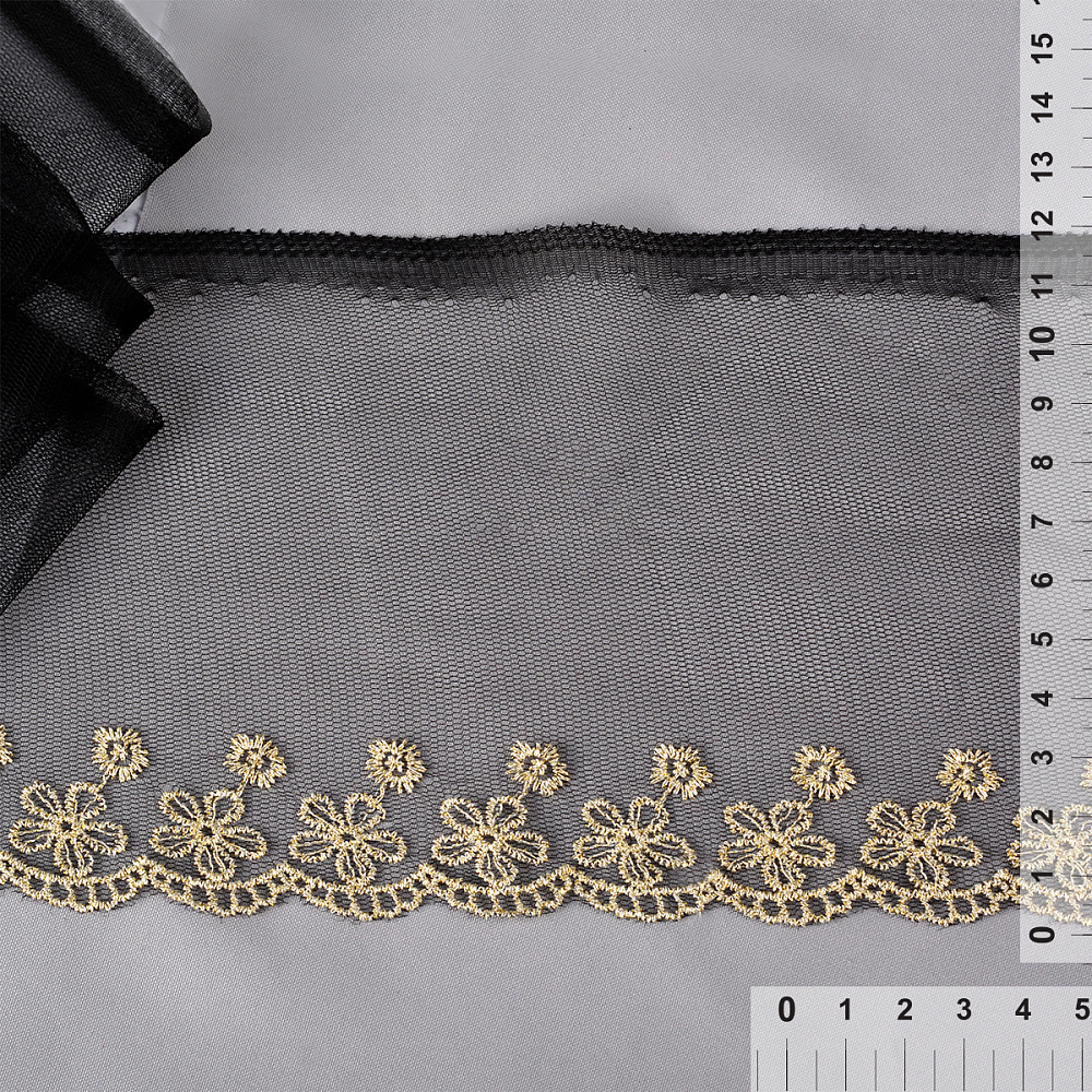 Кружево на сетке широкое 120 мм, диз. 203, цв.черный/золото уп. 13.71 м, Kruzhevo