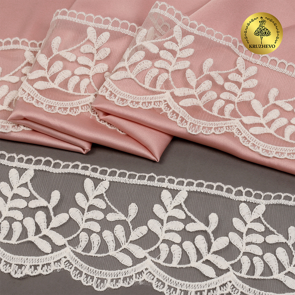Очень красивый и нежный дизайн кружева на сетке. Кружево приятное на ощупь, качественное. Вышивка выполнена матовой нитью. Смотрится очень красиво и нежно. Идеально подойдет для отделки одежды, домашнего текстиля, детских конвертов.