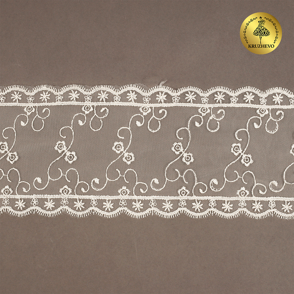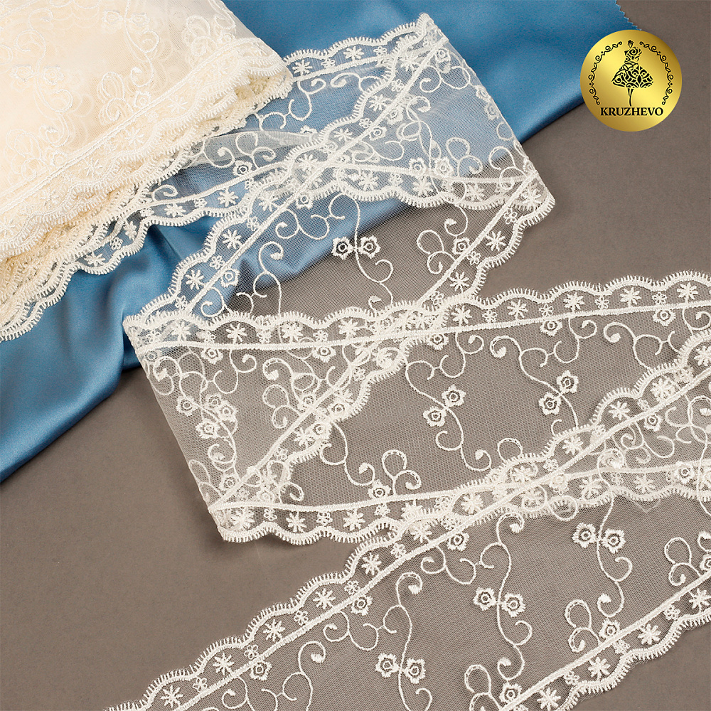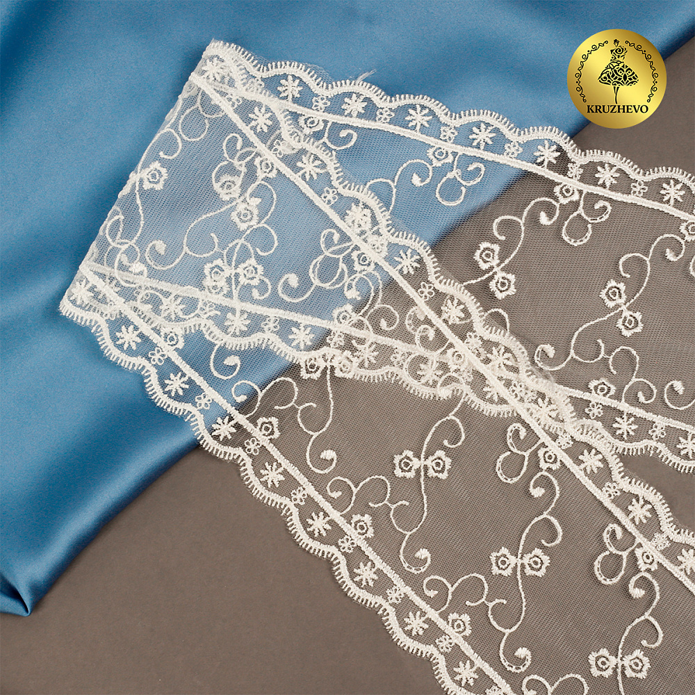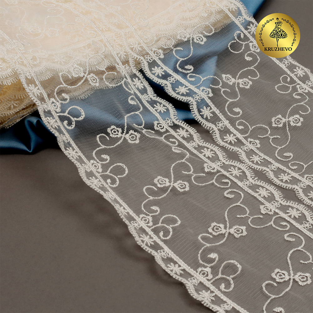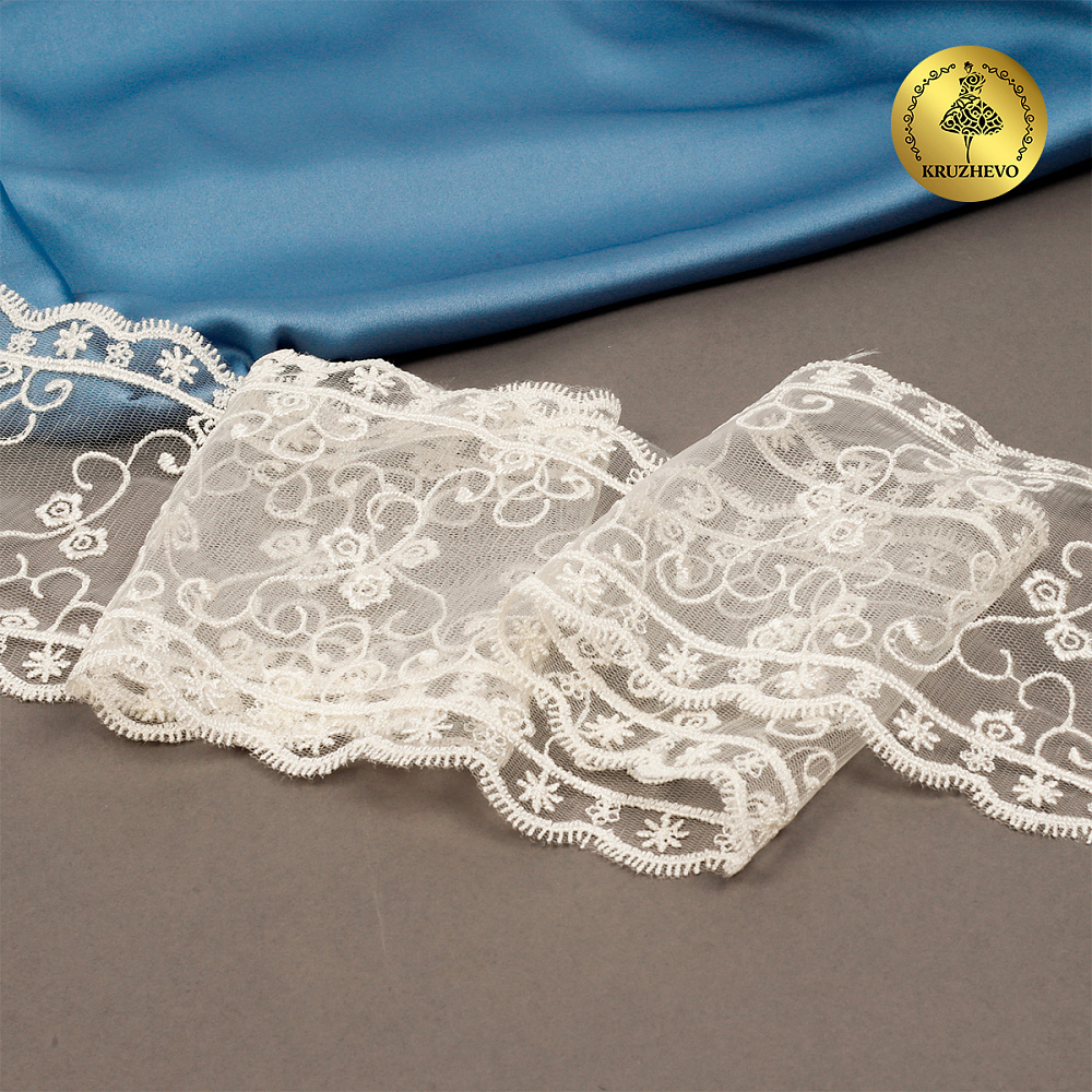 Очень красивый и нежный дизайн кружева на сетке. Кружево приятное на ощупь, качественное. Смотрится очень красиво и нежно. Идеально подойдет для отделки одежды, домашнего текстиля, детских конвертов.
