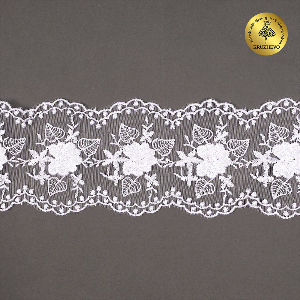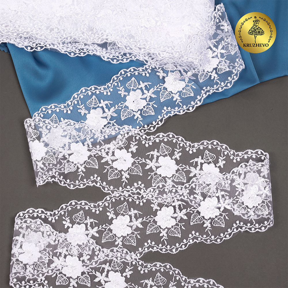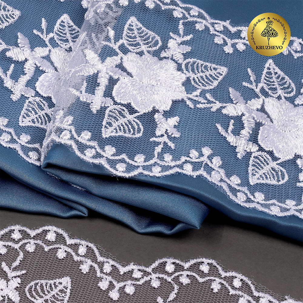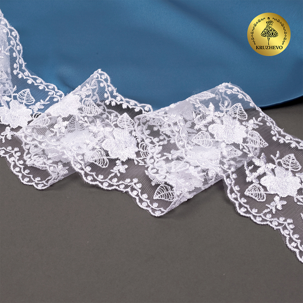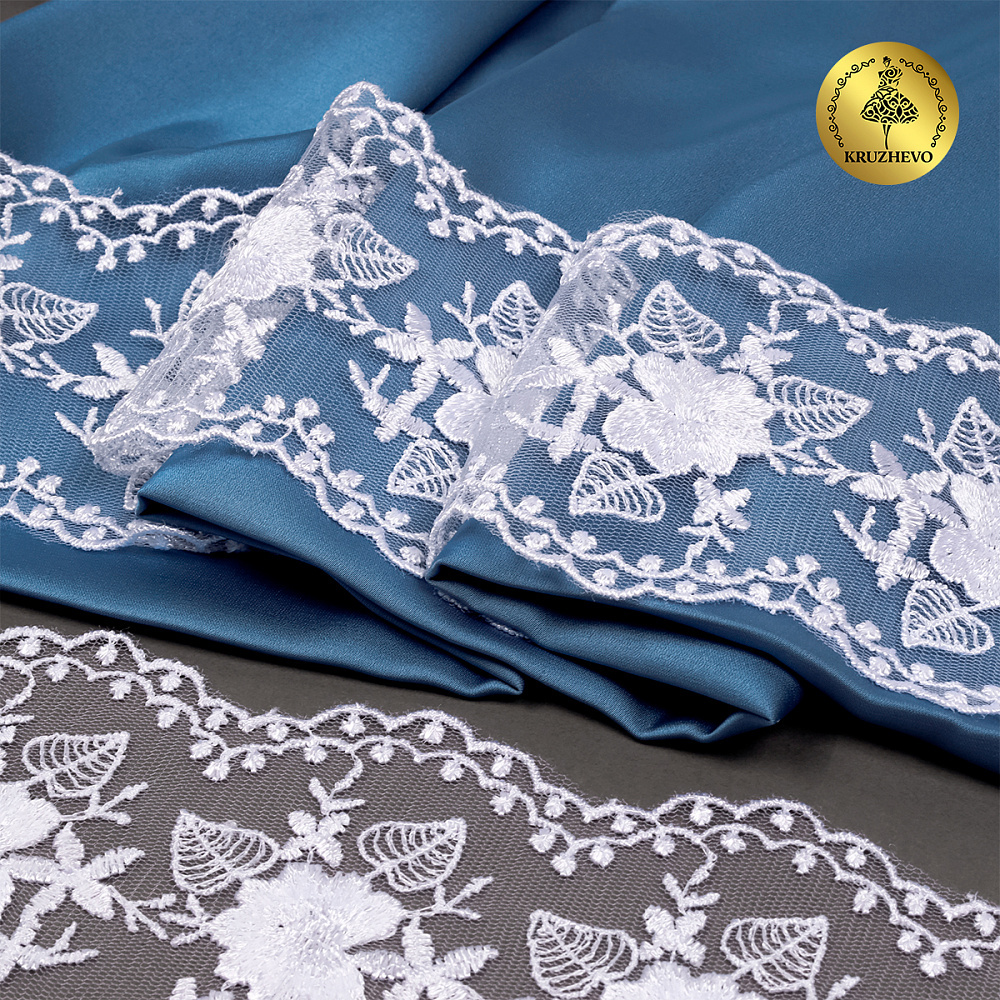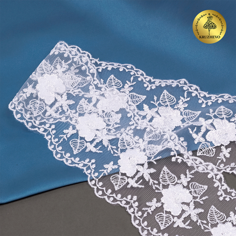 Очень красивый и нежный дизайн кружева на сетке. Кружево приятное на ощупь, качественное. Смотрится очень красиво и нежно. Идеально подойдет для отделки одежды, домашнего текстиля, детских конвертов.