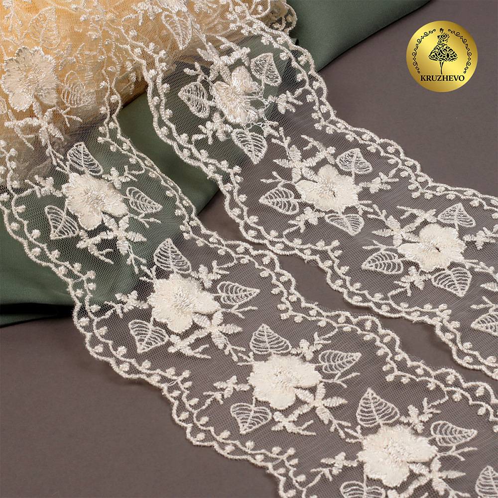 Очень красивый и нежный дизайн кружева на сетке. Кружево приятное на ощупь, качественное. Смотрится очень красиво и нежно. Идеально подойдет для отделки одежды, домашнего текстиля, детских конвертов.