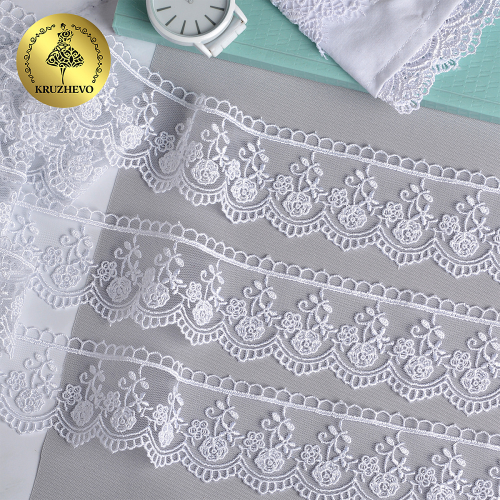 Очень красивое и нежное кружево на мягкой сетке. Воздушное, тонкое, приятное на ощупь. Кружево на сетке подходит, как для шитья, отделки, так и для скрапбукинга, изготовления кукол, свадебных украшений и одежды в стиле эко, бохо и шебби - шик.