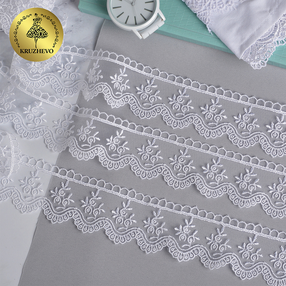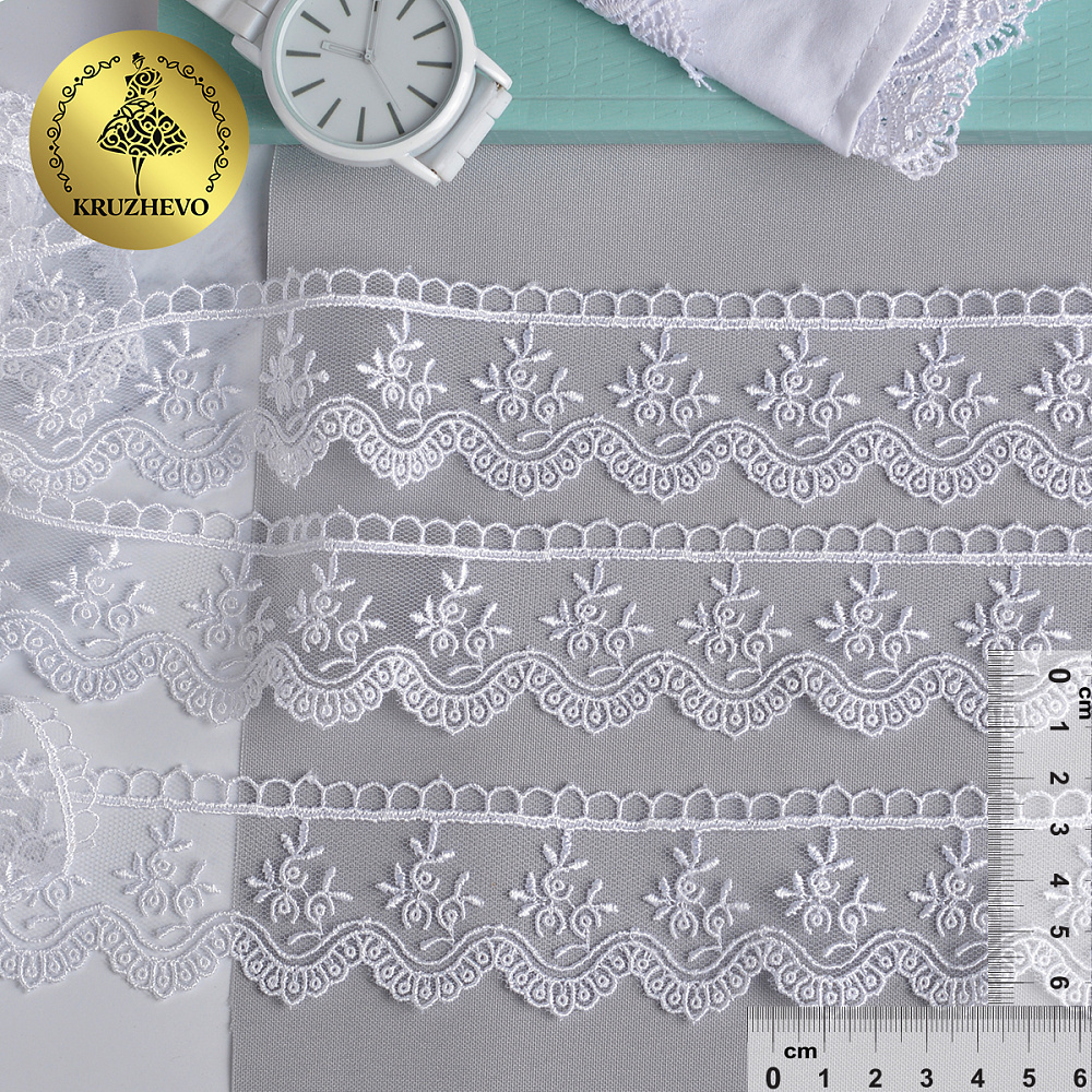 Очень красивое и нежное кружево на мягкой сетке. Воздушное, тонкое, приятное на ощупь. Кружево на сетке подходит, как для шитья, отделки, так и для скрапбукинга, изготовления кукол, свадебных украшений и одежды в стиле эко, бохо и шебби-шик.