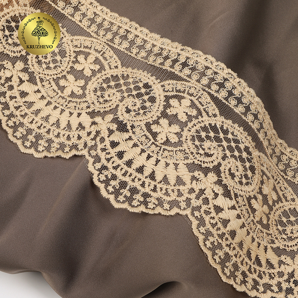 Очень красивый и нежный дизайн кружева на сетке от бренда Kruzhevo. Кружево приятное на ощупь/ качественное. Вышивка выполнена матовой нитью. Смотрится очень красиво и нежно. Идеально подойдет для отделки одежды/ домашнего текстиля/ детских конвертов.