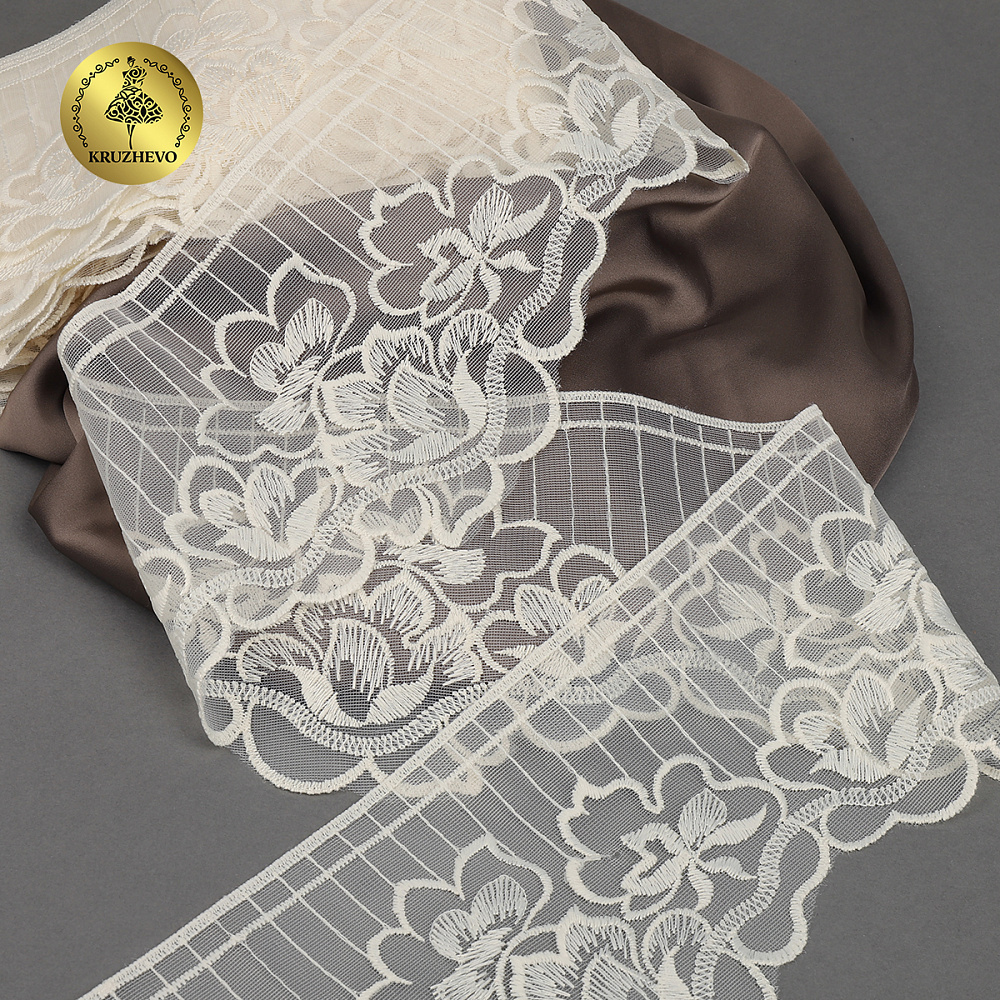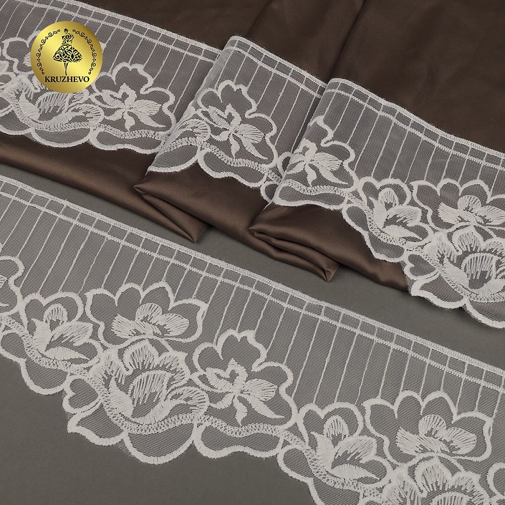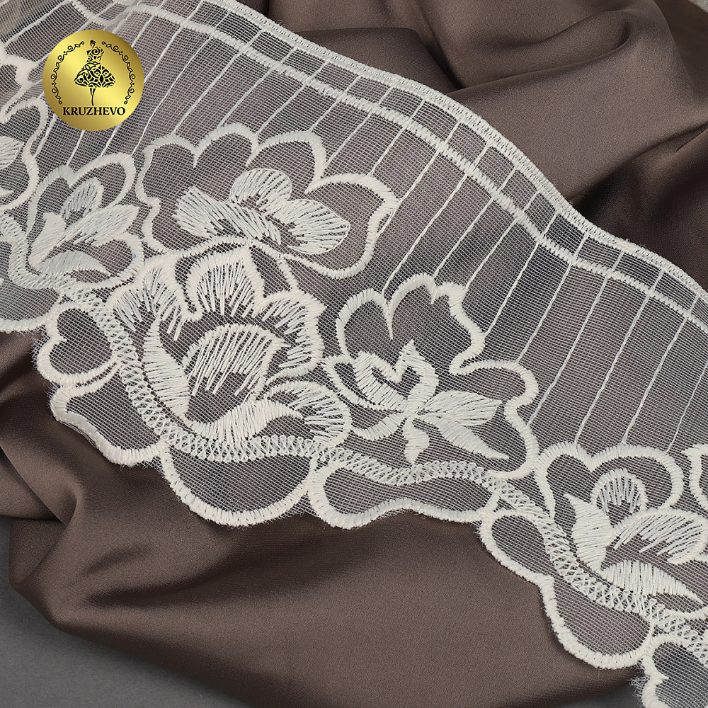 Очень красивый и нежный дизайн кружева на сетке от бренда Kruzhevo. Кружево приятное на ощупь/ качественное. Смотрится очень красиво и нежно. Идеально подойдет для отделки одежды/ домашнего текстиля/ детских конвертов.