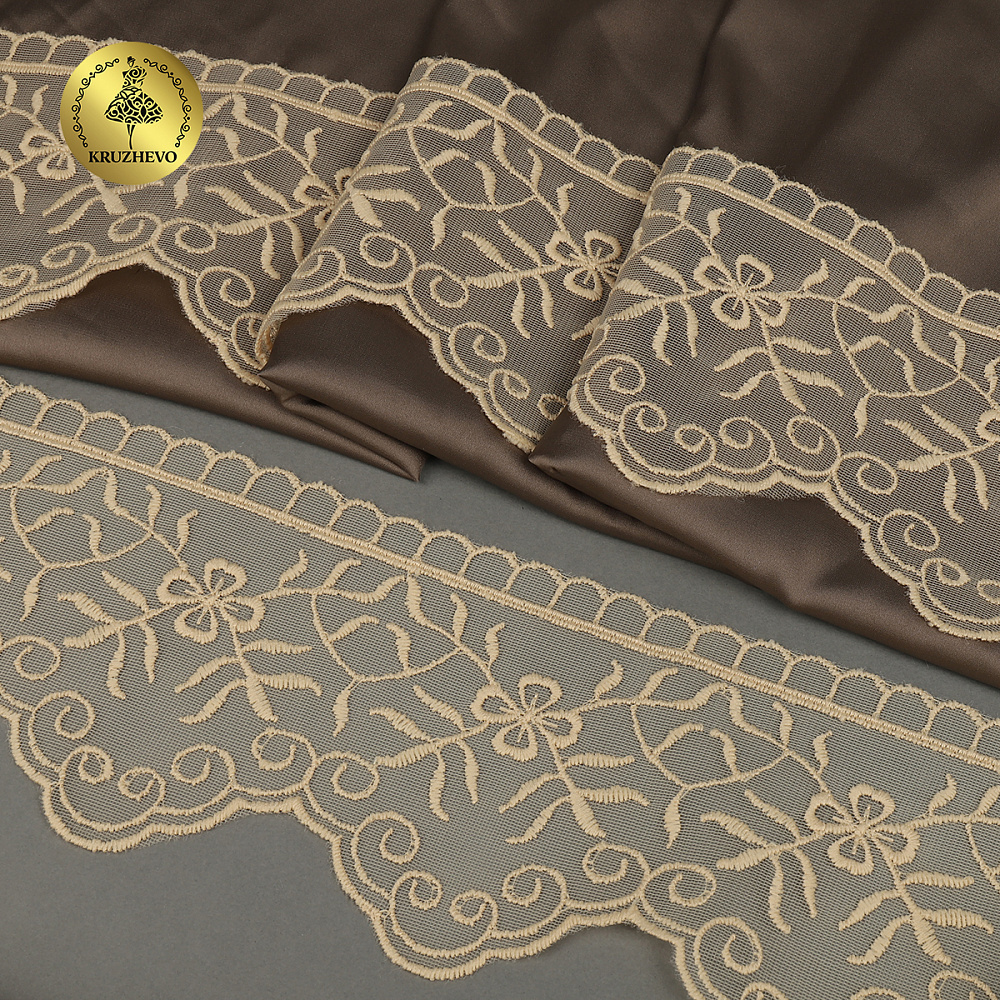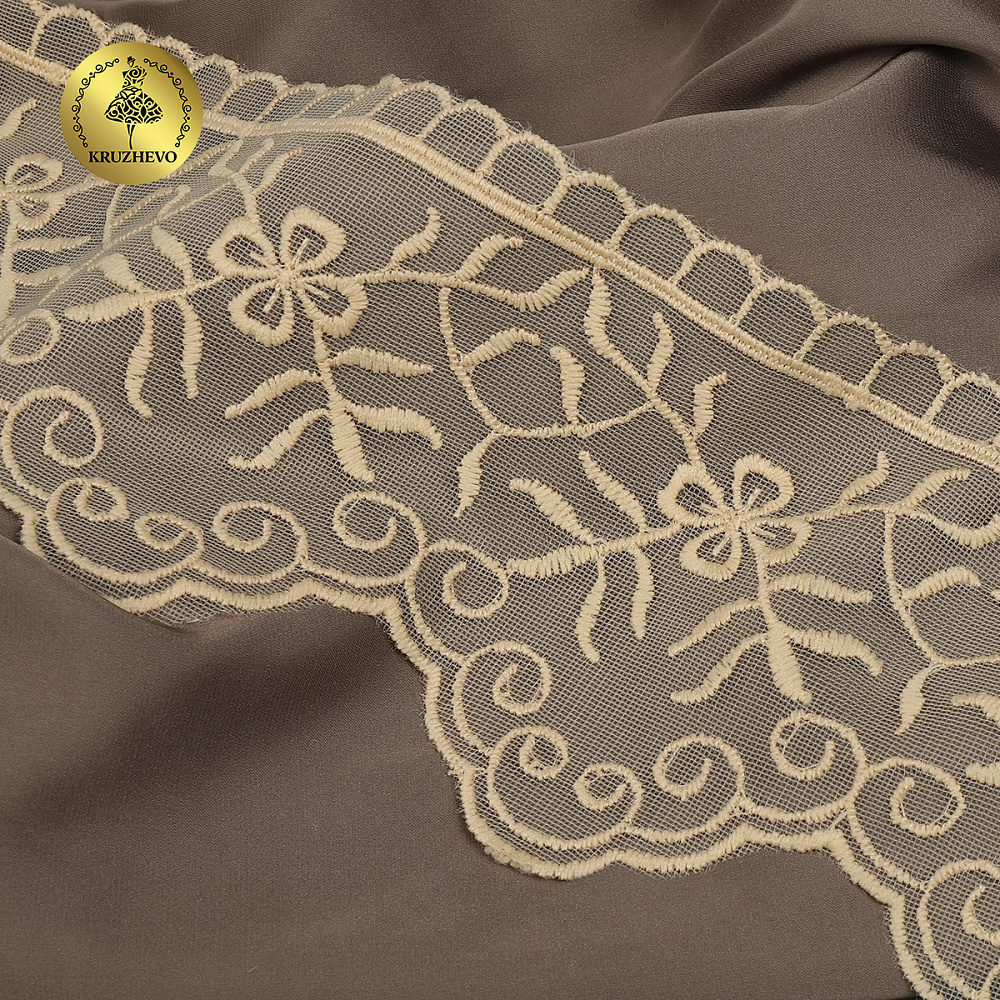 Очень красивый и нежный дизайн кружева на сетке от бренда Kruzhevo. Кружево приятное на ощупь/ качественное. Смотрится очень красиво и нежно. Идеально подойдет для отделки одежды/ домашнего текстиля/ детских конвертов.