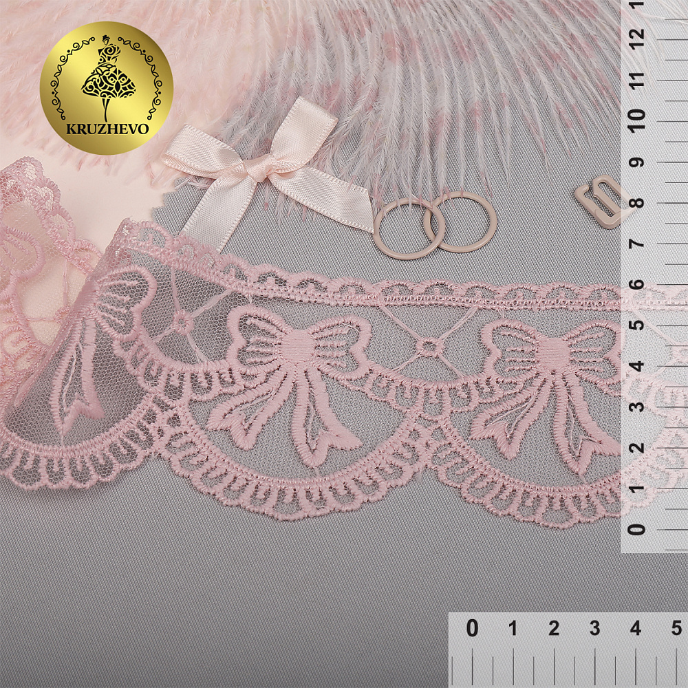Кружево на сетке с матовой нитью с бантиками 60 мм, диз. 196, цв.розовый уп. 13.71 м, Kruzhevo