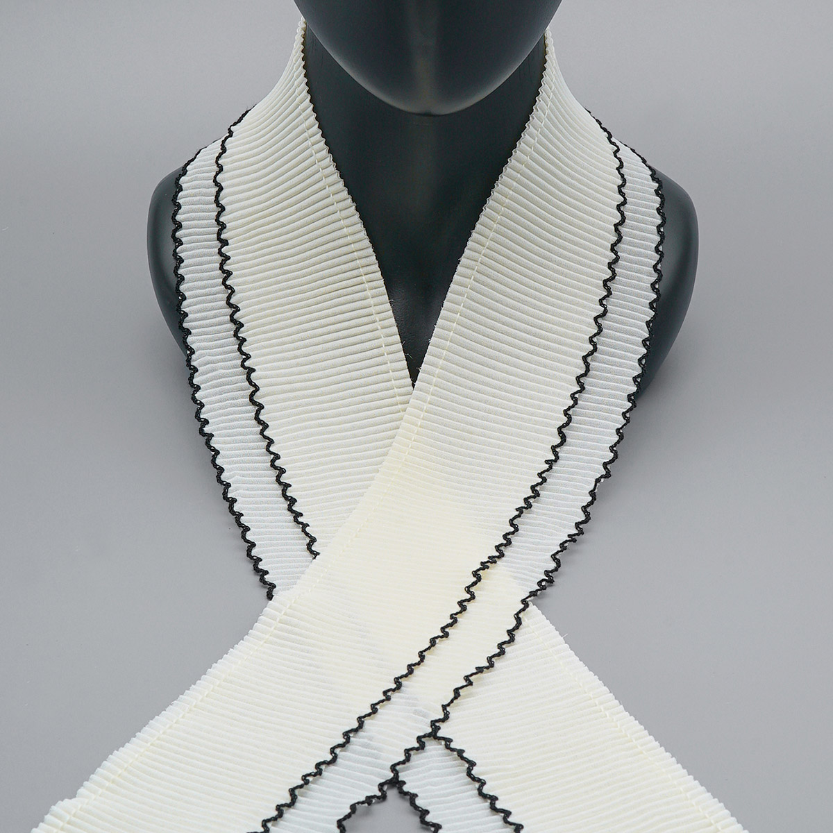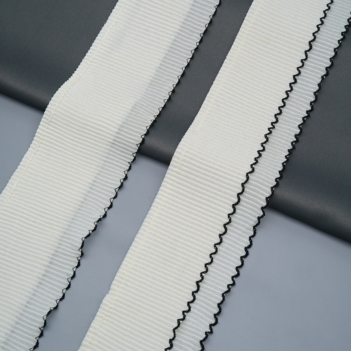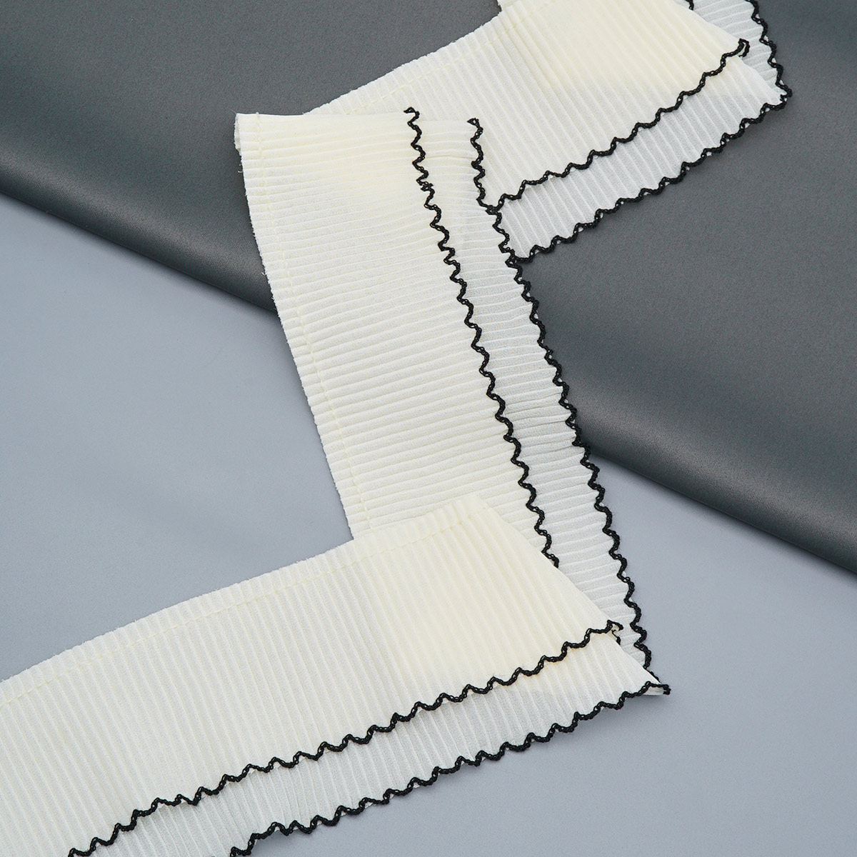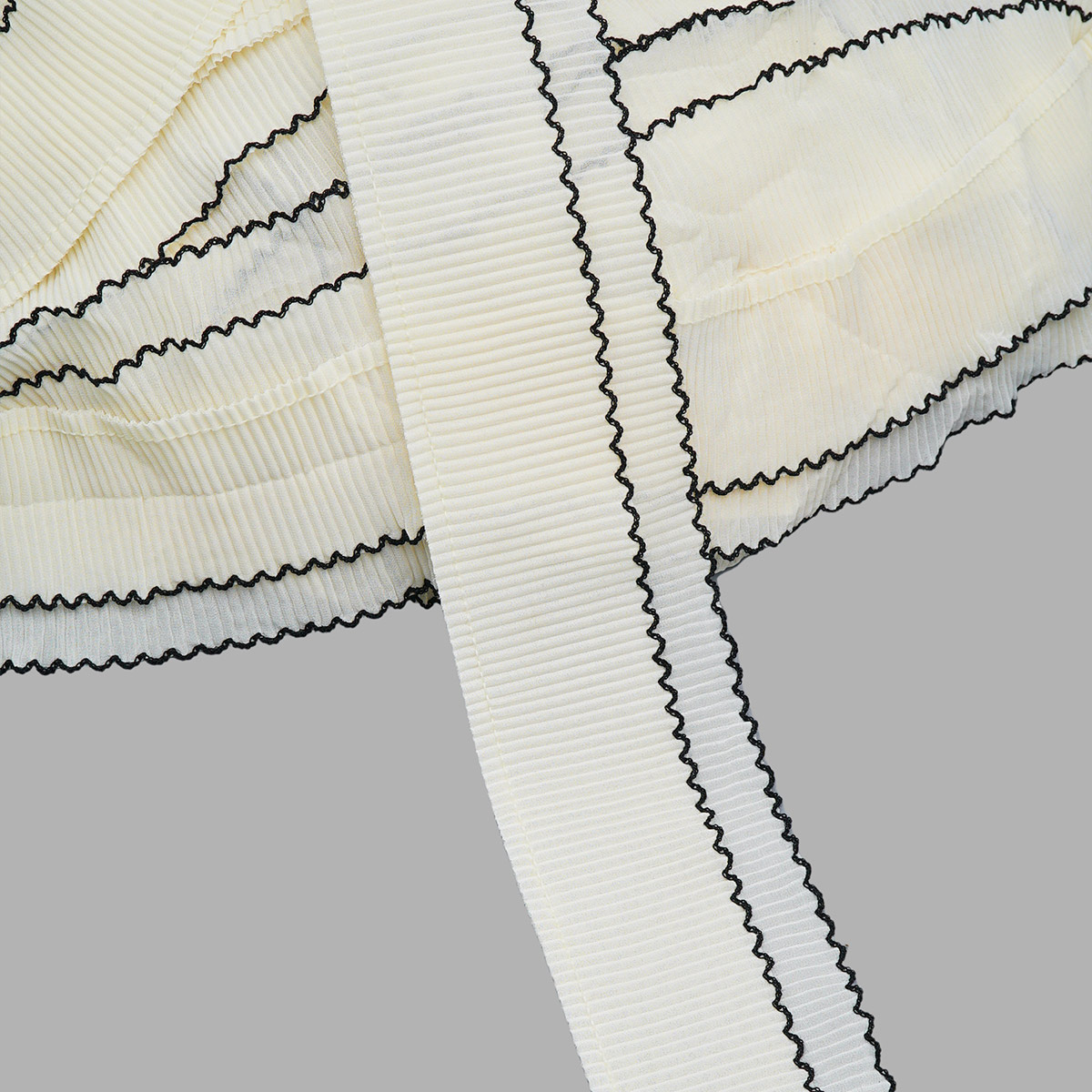 Кружево плиссированное 80 мм, / 45.72 метра, складка плиссе, двухслойное, цв. молочный с черным краем