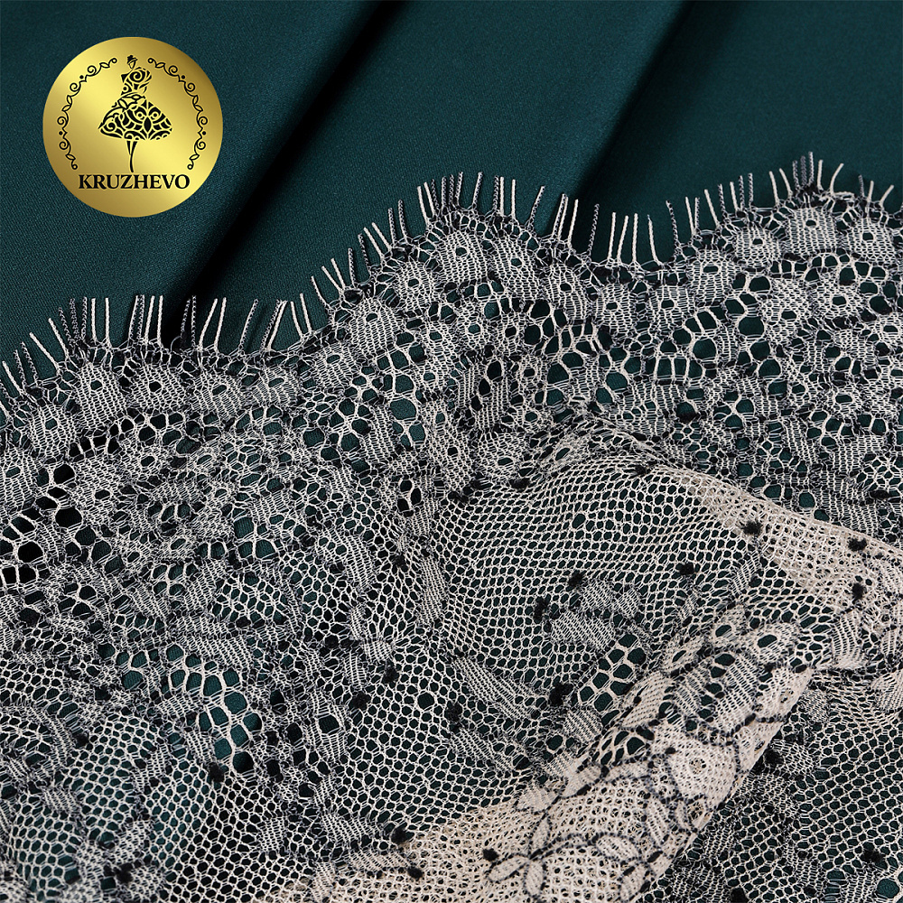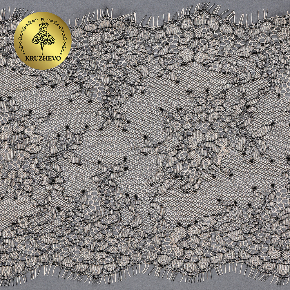 Французское кружево Шантильи с "ресничками". Смотрится очень фактурно за счет корда. Кружево неэластичное. Тянется лишь слегка за счет переплетения нитей. Кружево очень тоненькое и воздушное, но при этом прочное. Качество очень хорошее, премиум - сегмент. Идеально подходит для пошива нижнего белья, элегантной домашней одежды. Дизайн выполнен в стиле Victoria Secret.