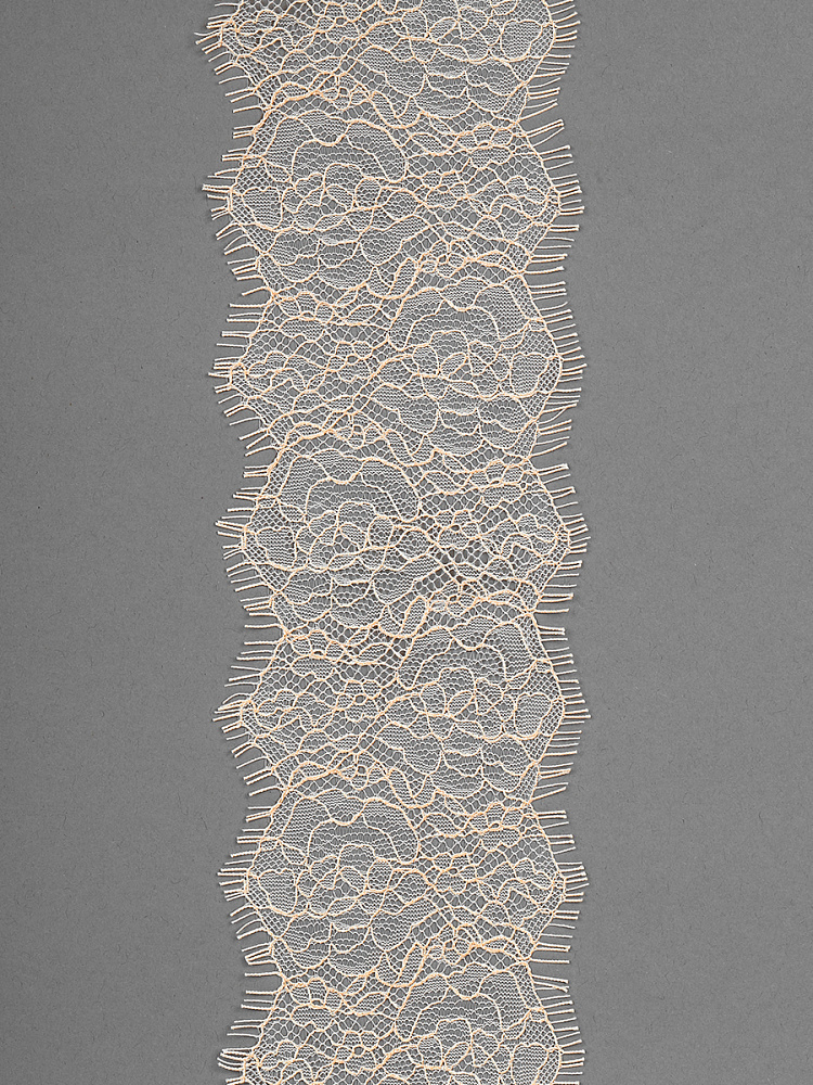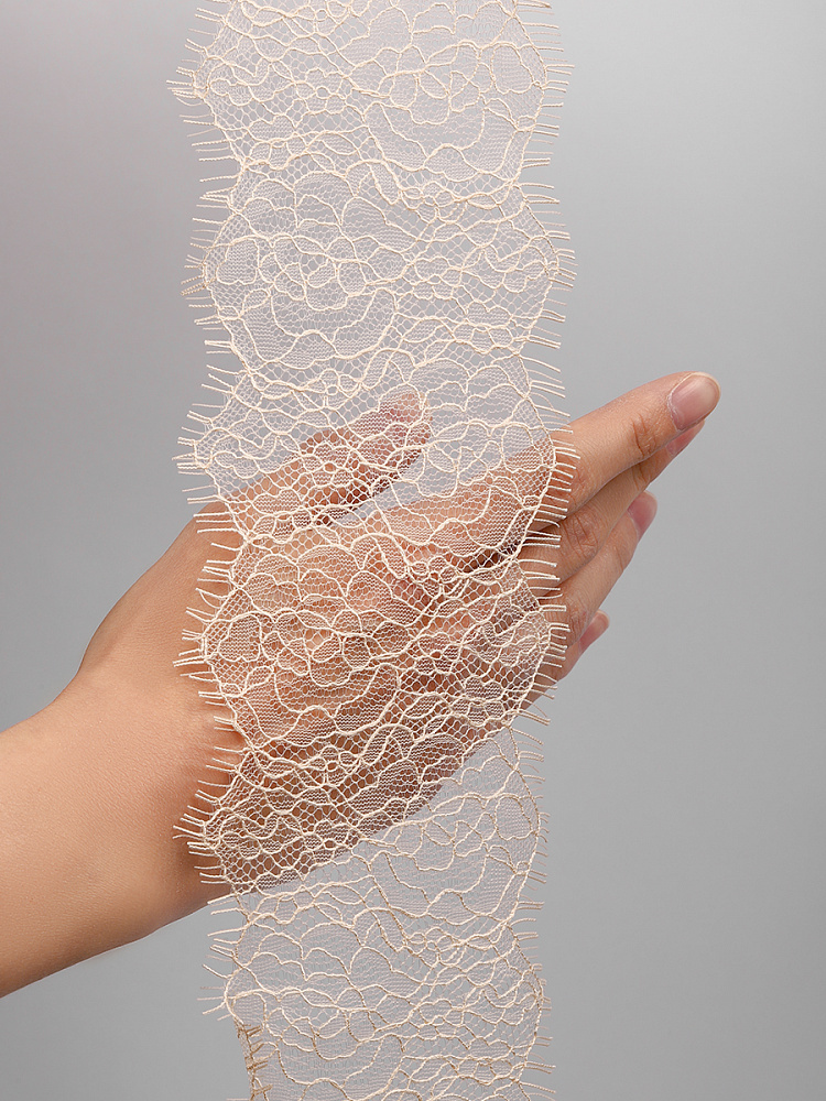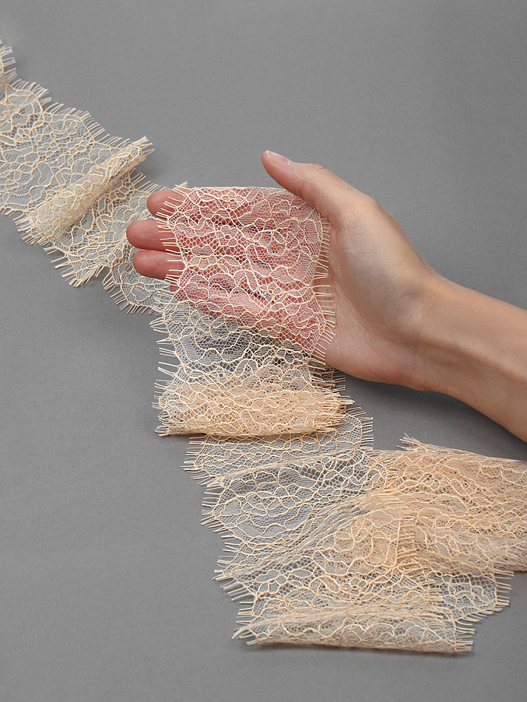 Французское кружево Шантильи с 'ресничками' от бренда Kruzhevo, неэластичное. Смотрится очень фактурно за счет корда. Кружево очень тоненькое и воздушное, но при этом прочное.Тянется лишь слегка за счет переплетения нитей. Идеально подходит для пошива нижнего белья, элегантной домашней одежды.