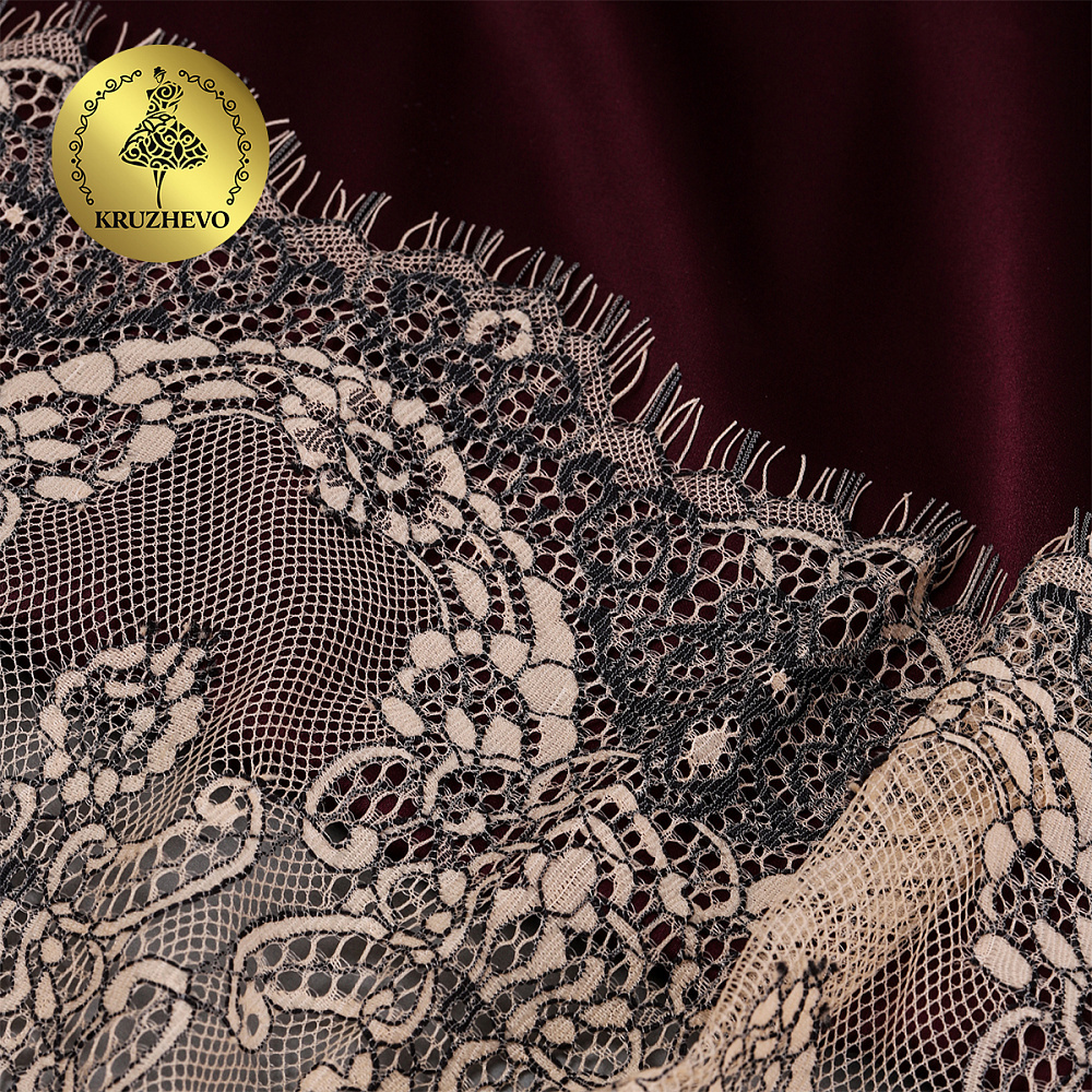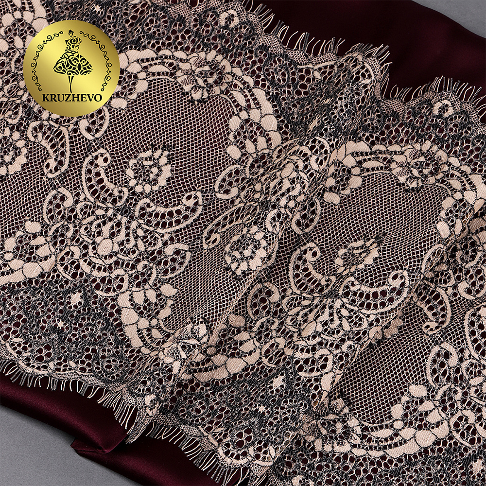 Французское кружево Шантильи с "ресничками". Смотрится очень фактурно за счет корда. Дизайн просто невероятный! Кружево неэластичное. Тянется лишь слегка за счет переплетения нитей. Кружево очень тоненькое и воздушное, но при этом прочное. Тактильно - очень приятное на ощупь. Качество очень хорошее, премиум - сегмент. Идеально подходит для пошива нижнего белья, элегантной домашней одежды.