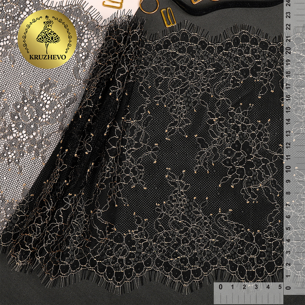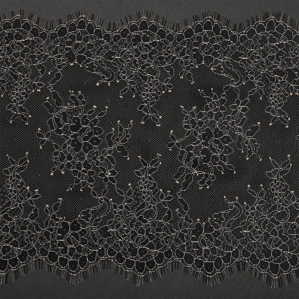 Французское кружево Шантильи с "ресничками". Смотрится очень фактурно за счет корда. Сочетание черного цвета с золотой нитью - делает дизайн необыкновенно ярким и элегантным! Кружево неэластичное. Тянется лишь слегка за счет переплетения нитей. Кружево очень тоненькое и воздушное, но при этом прочное. Тактильно - очень приятное на ощупь. Качество очень хорошее, премиум - сегмент. Идеально подходит для пошива нижнего белья, элегантной домашней одежды.
