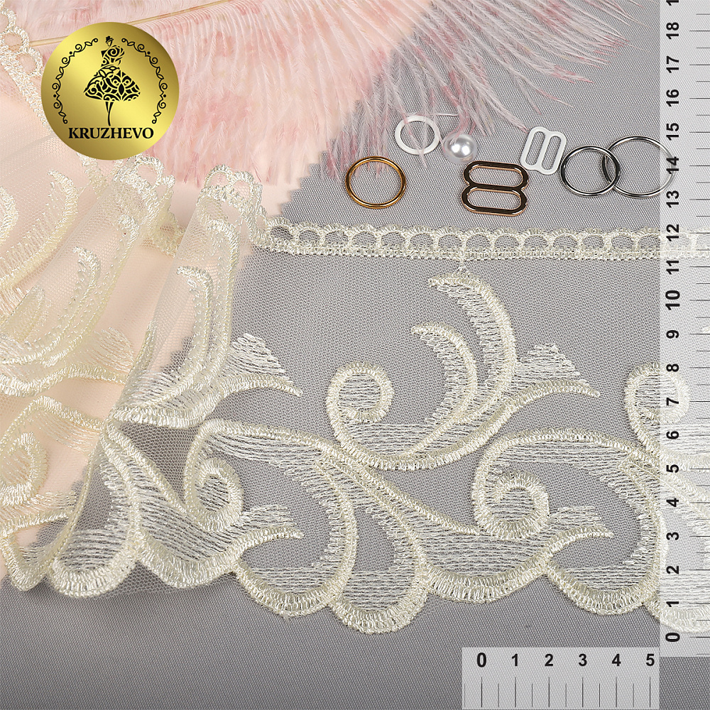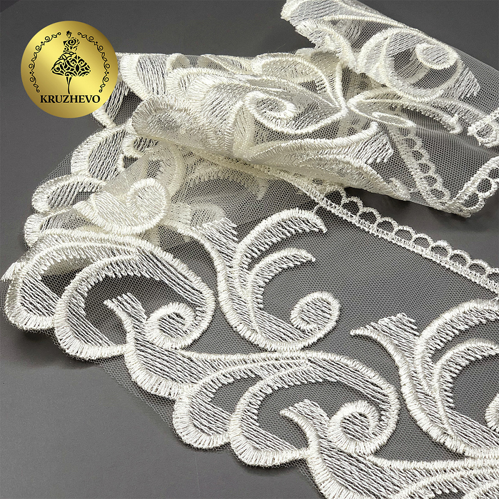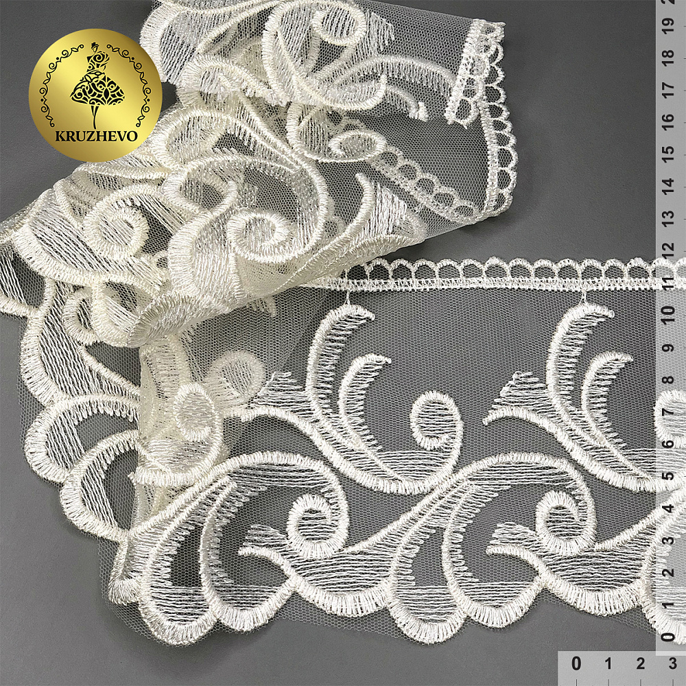 Широкое кружево на сетке с вышивкой. Кружево приятное на ощупь, качественное. Идеально подойдет для домашнего текстиля, детских конвертов.