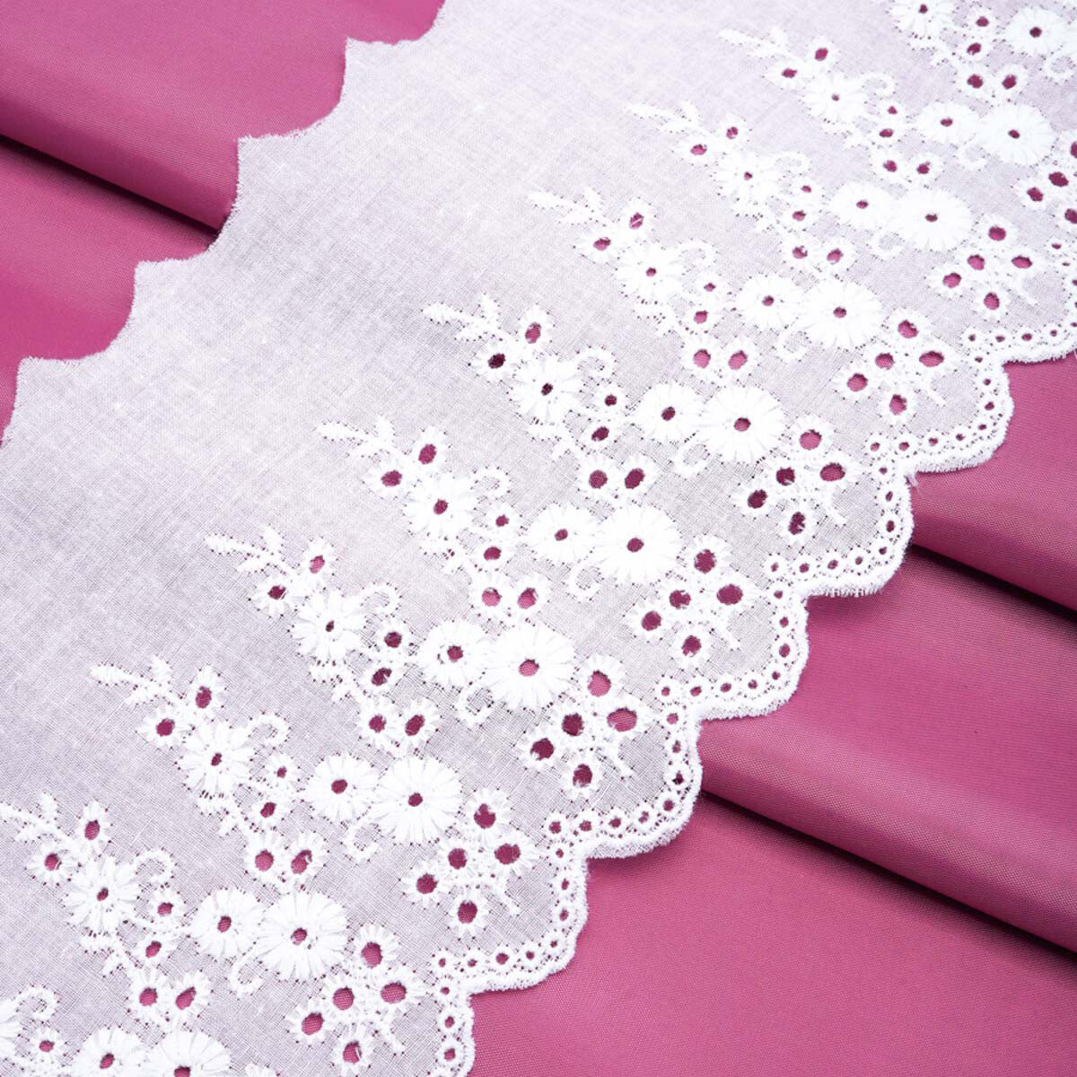 Кружевное шитьё – полоска ткани с ажурной вышивкой в стиле 'ришелье'. Эта деталь поможет вам украсить однотонные домашние вещи из хлопка, льна и других натуральных материалов, придать вещам нежности и нарядности. Такими вещами могут быть: – ночные сорочки; – предметы гардероба для новорожденных – чепчики, распашонки, конверты, уголки; – шторы для спальни или детской комнаты; – комплект постельного белья. Пришивается вручную или с помощью простой машинной строчки. Рекомендации по уходу: деликатная стирка при температуре 30 градусов. Гладить через влажную ткань. Цвет: белоснежный. Материал: 100% хлопок. Размер: ширина 11,7 см, длина 3,4 м.