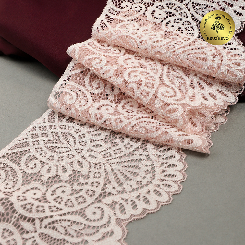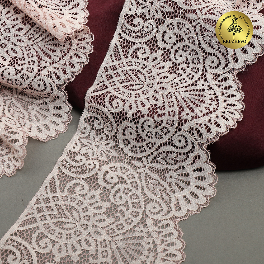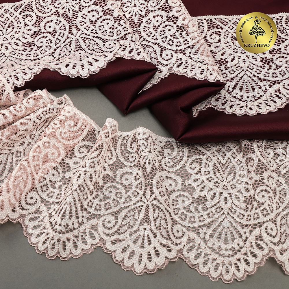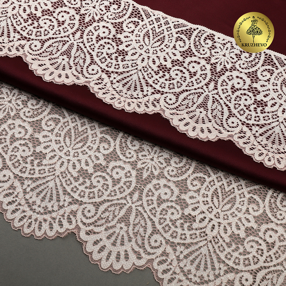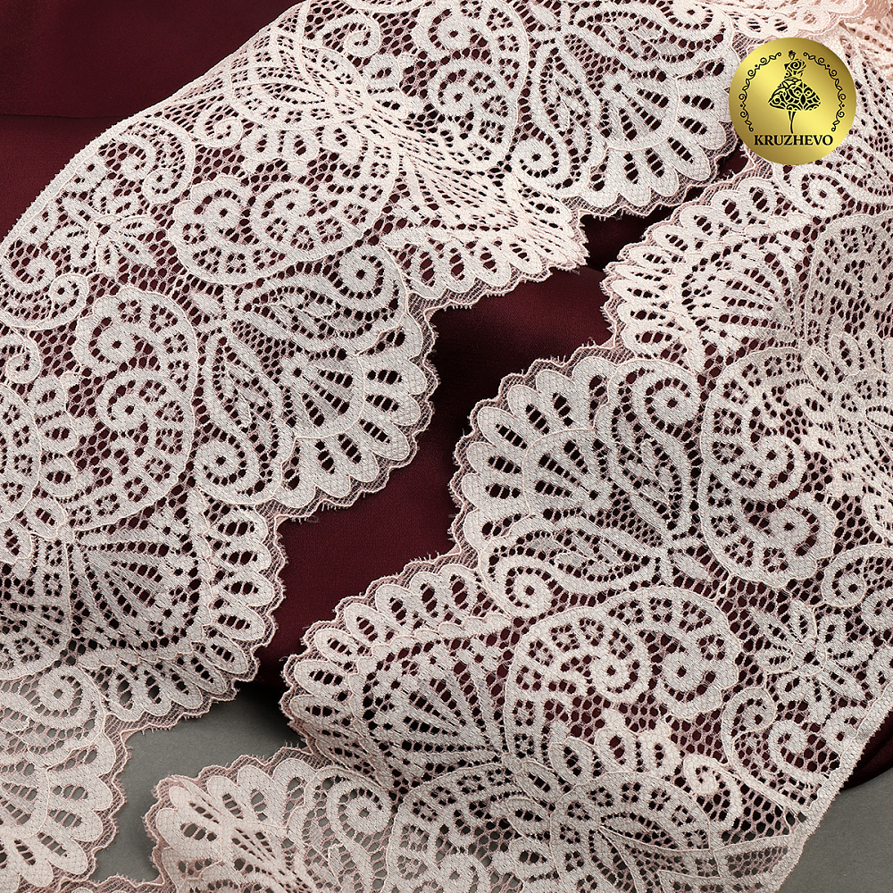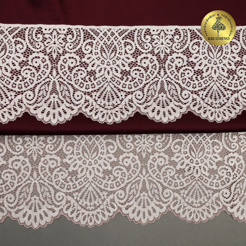 Очень красивое двухцветное кружево-стрейч с фестонами. Интересный дизайн - удобно сочетать в работе с другой фурнитурой. Идеально подойдет для пошива нижнего белья или домашней одежды.