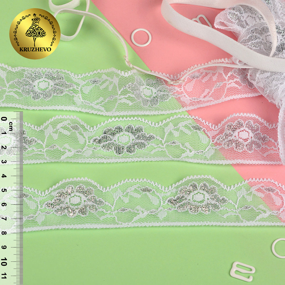 Кружево эластичное (стрейч) 33 мм, цв.белый/серебро уп. 18,3 м, Kruzhevo