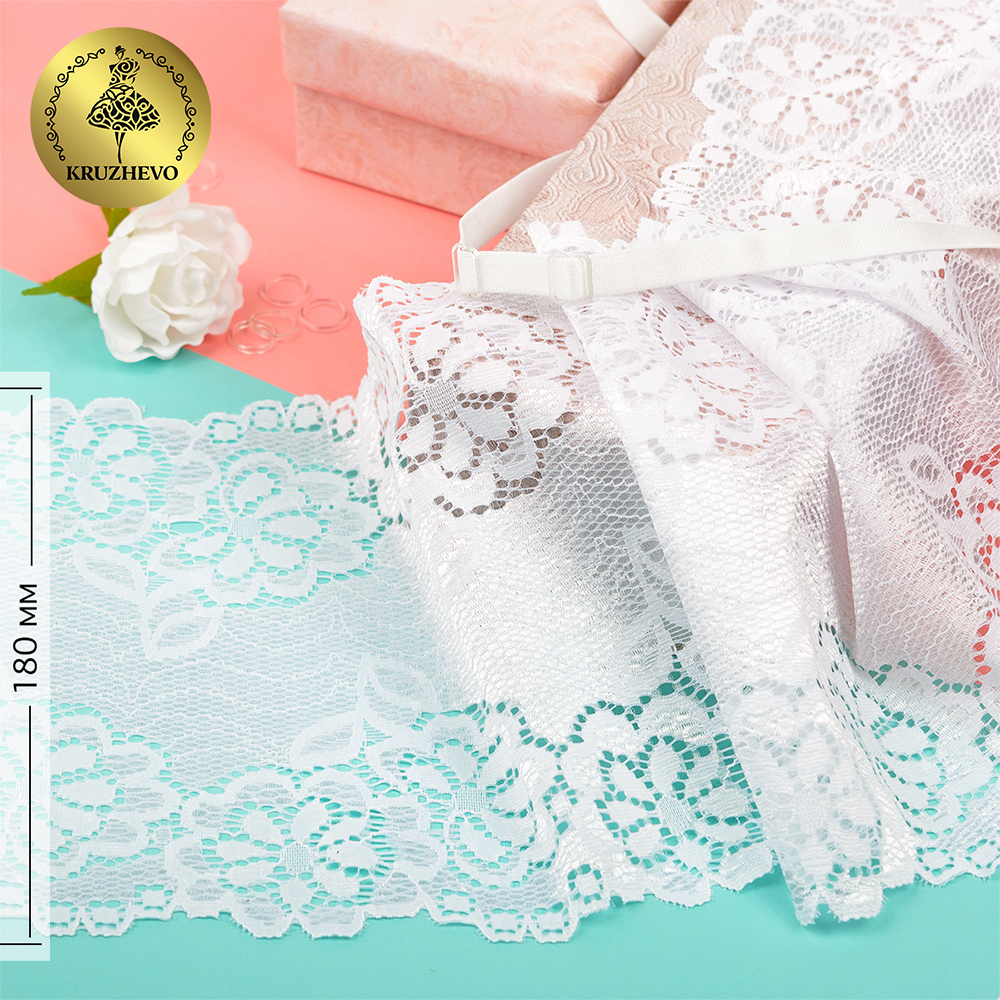 Кружево эластичное (стрейч) 180 мм, TBY 8001, белый, 9.14м, Kruzhevo