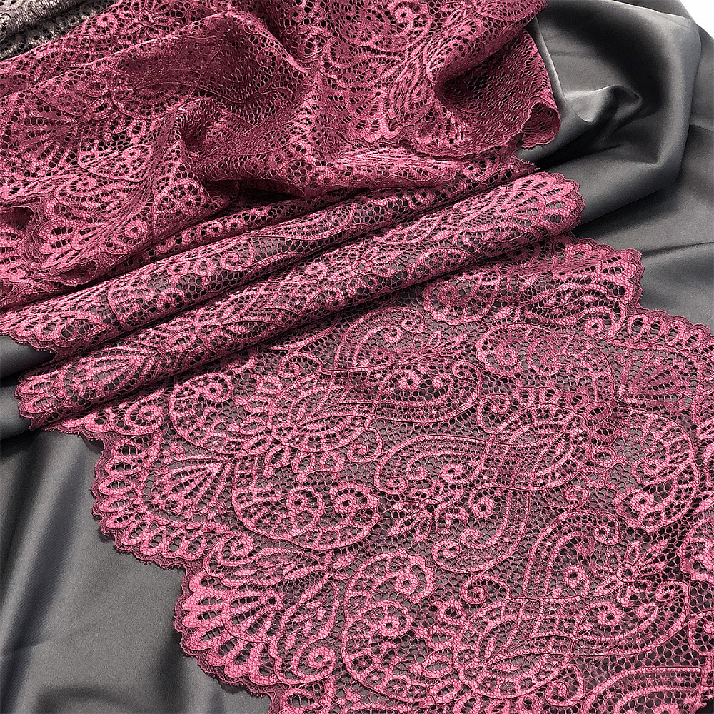 Очень красивый дизайн эластичного кружева. Кружево широкое, 23 см. Есть небольшой корд. Кружево упругое, хорошо тянется, не мнется. Смотрится дорого и оригинально. Качество премиум-сегмент. С таким кружевом работать одно удовольствие! Идеально подойдет для пошива нижнего белья и элегантной одежды для сна и отдыха.