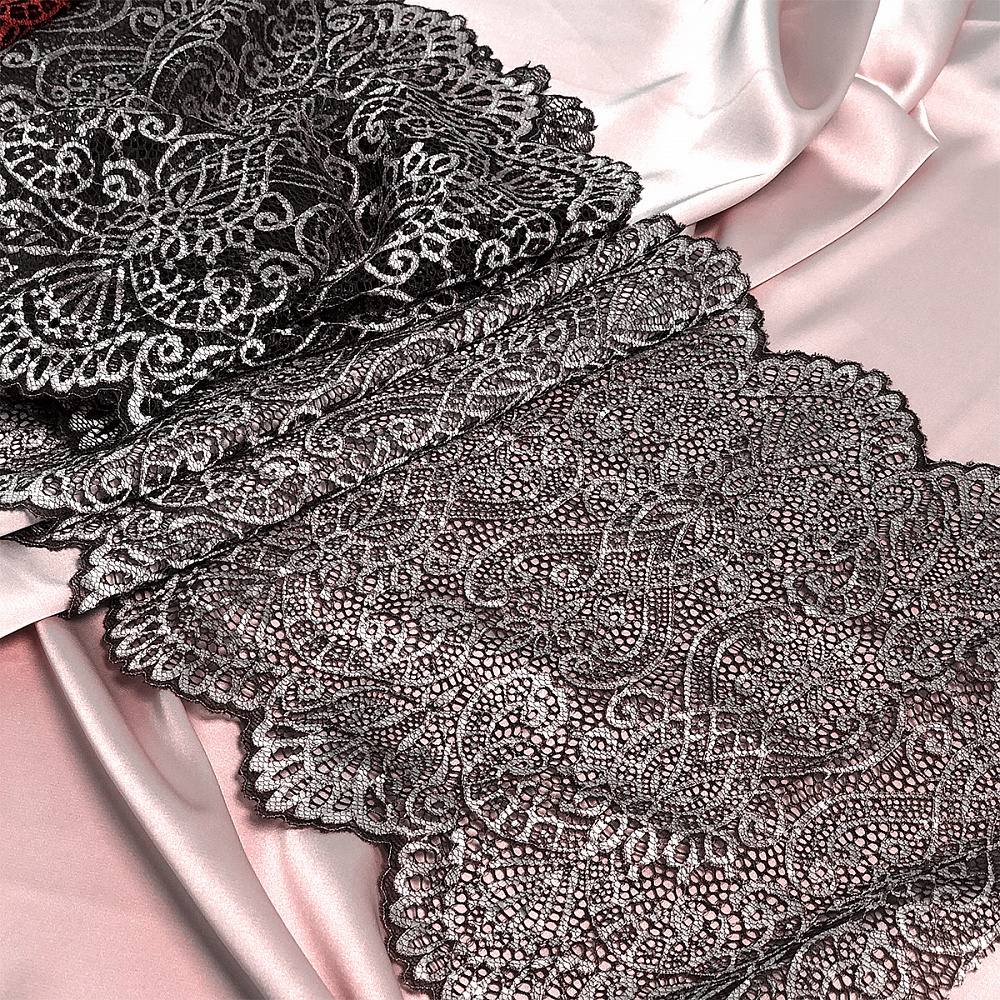 Кружево бельевое эластичное 240 мм / 120 м, Premium 40992, цв.168 серебристый пион+черный, Kruzhevo