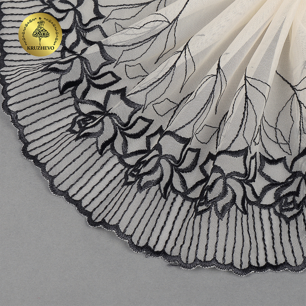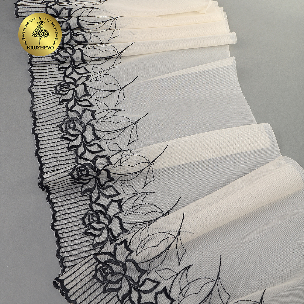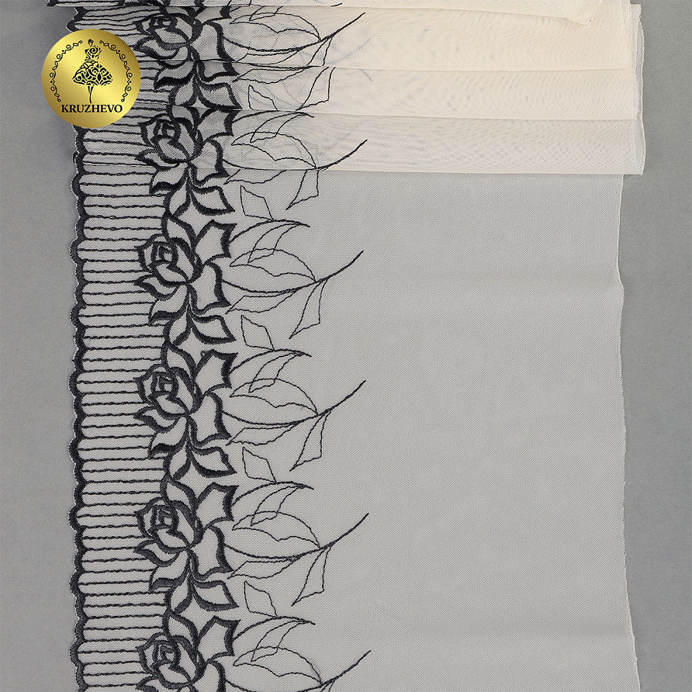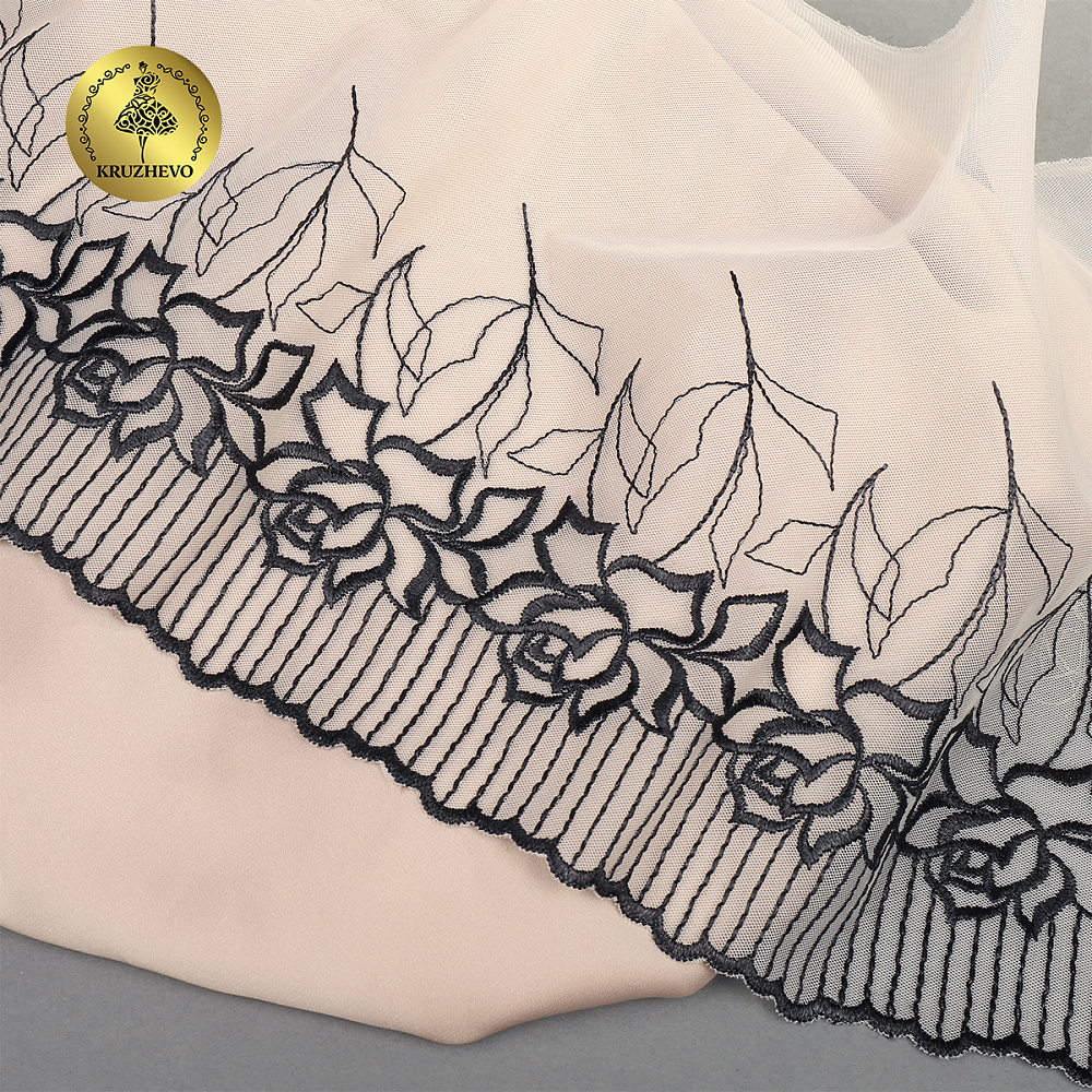 Кружево на сетке (вышитое) арт.T100 220мм цв.телесный+черный, левая уп.4,3м, Kruzhevo