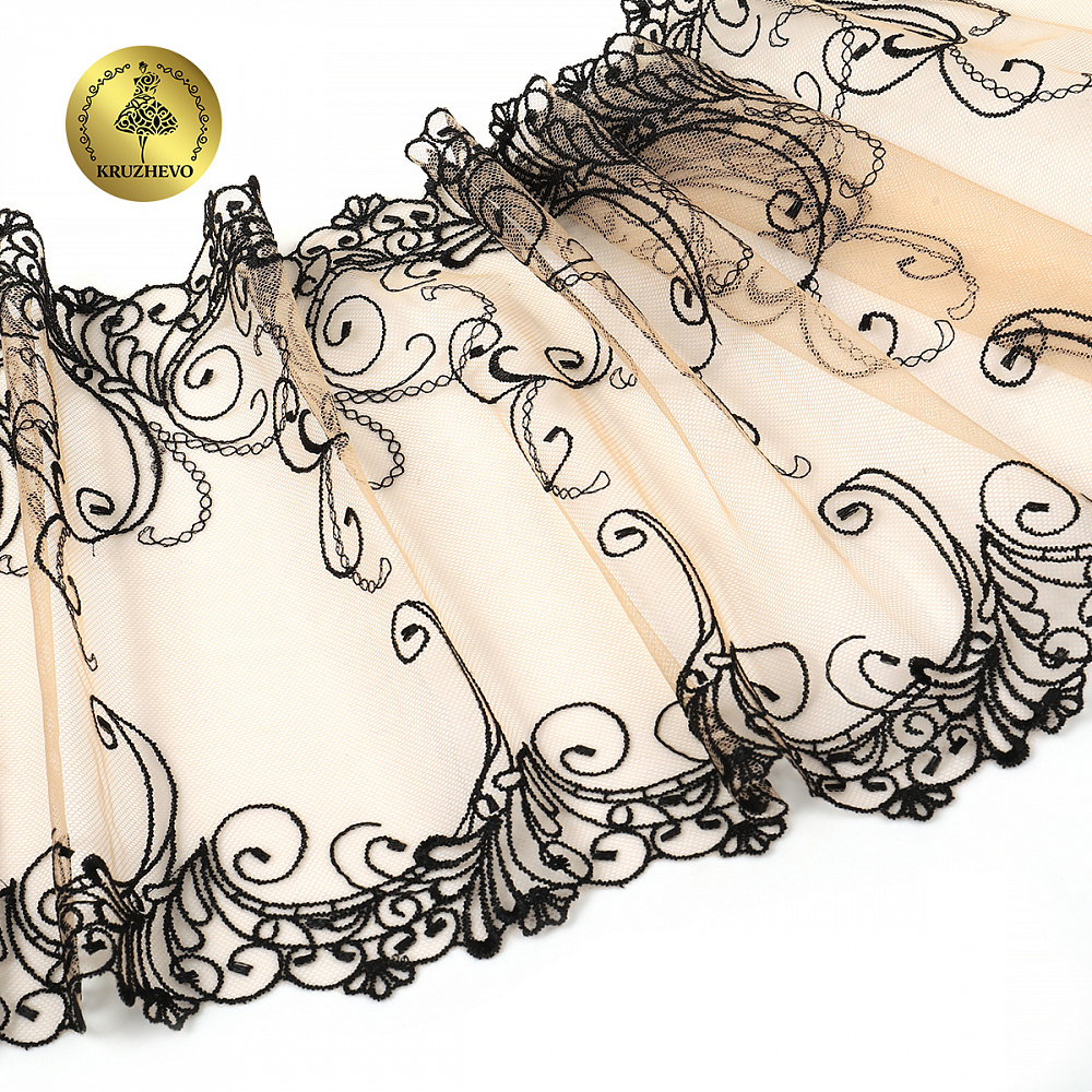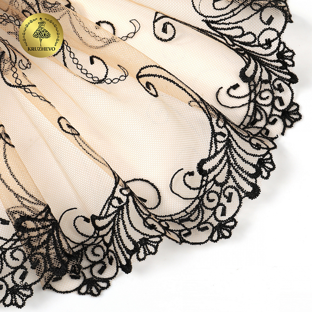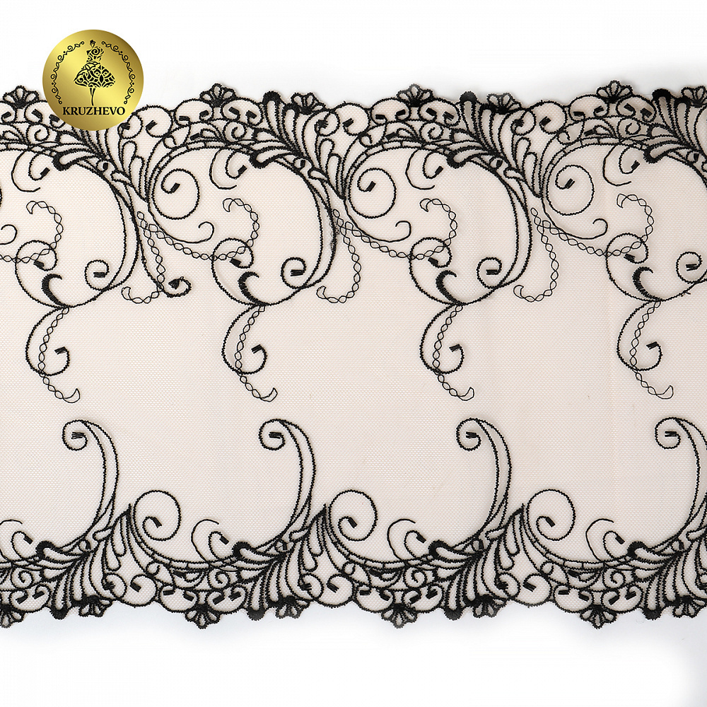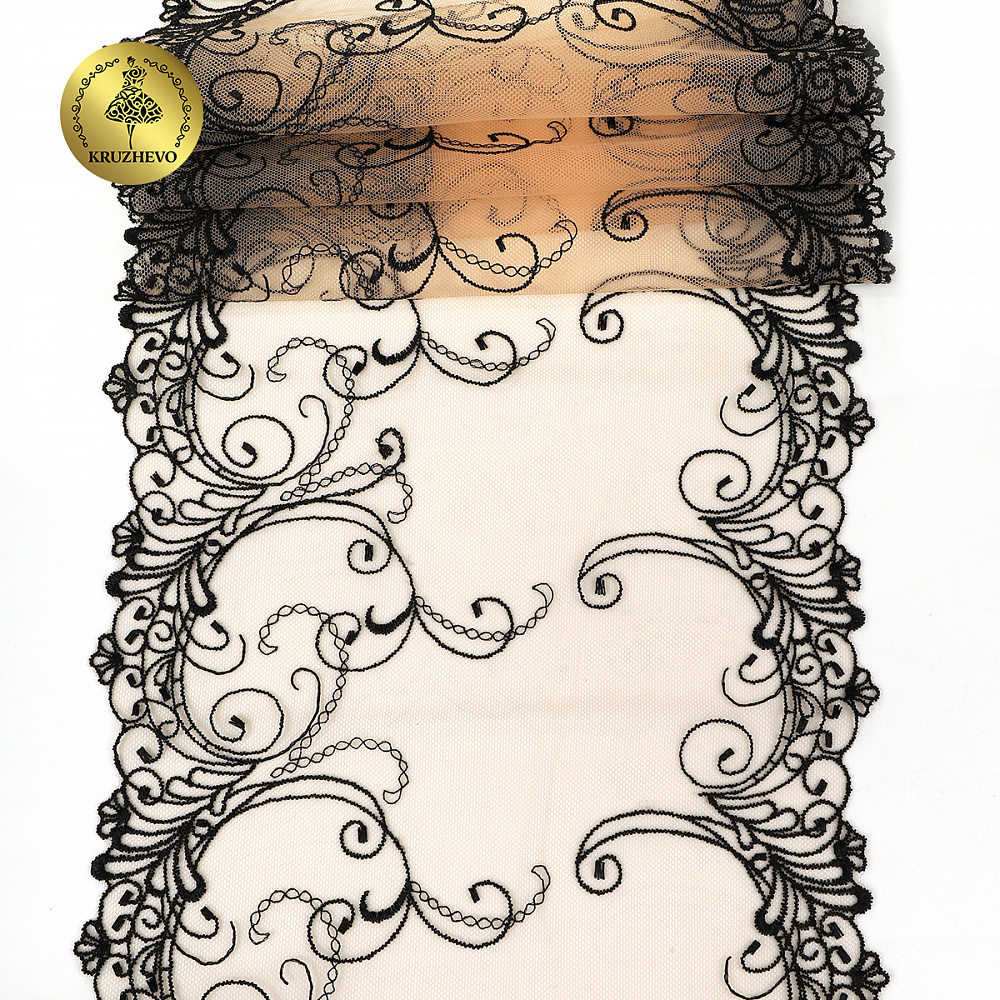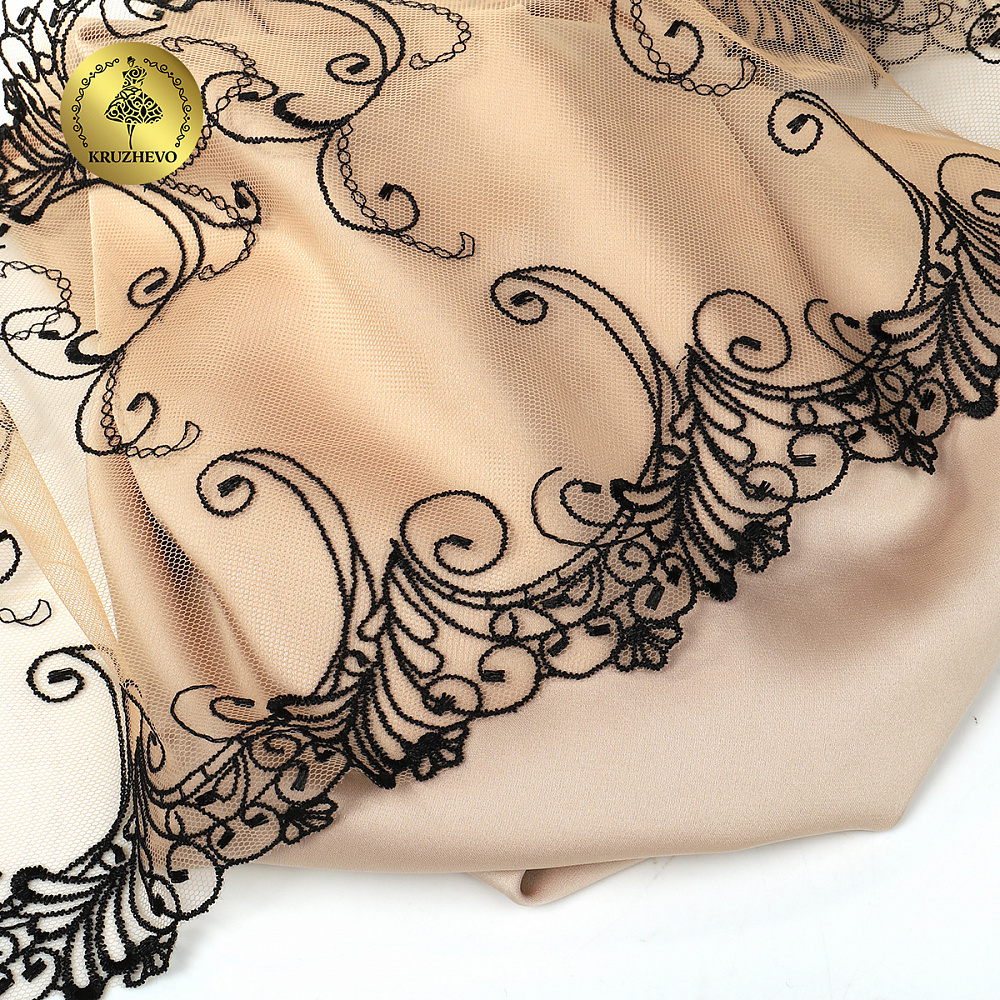 Кружево на сетке (вышитое) арт.T104 220мм цв.черный+телесный, правая уп.6,5м, Kruzhevo