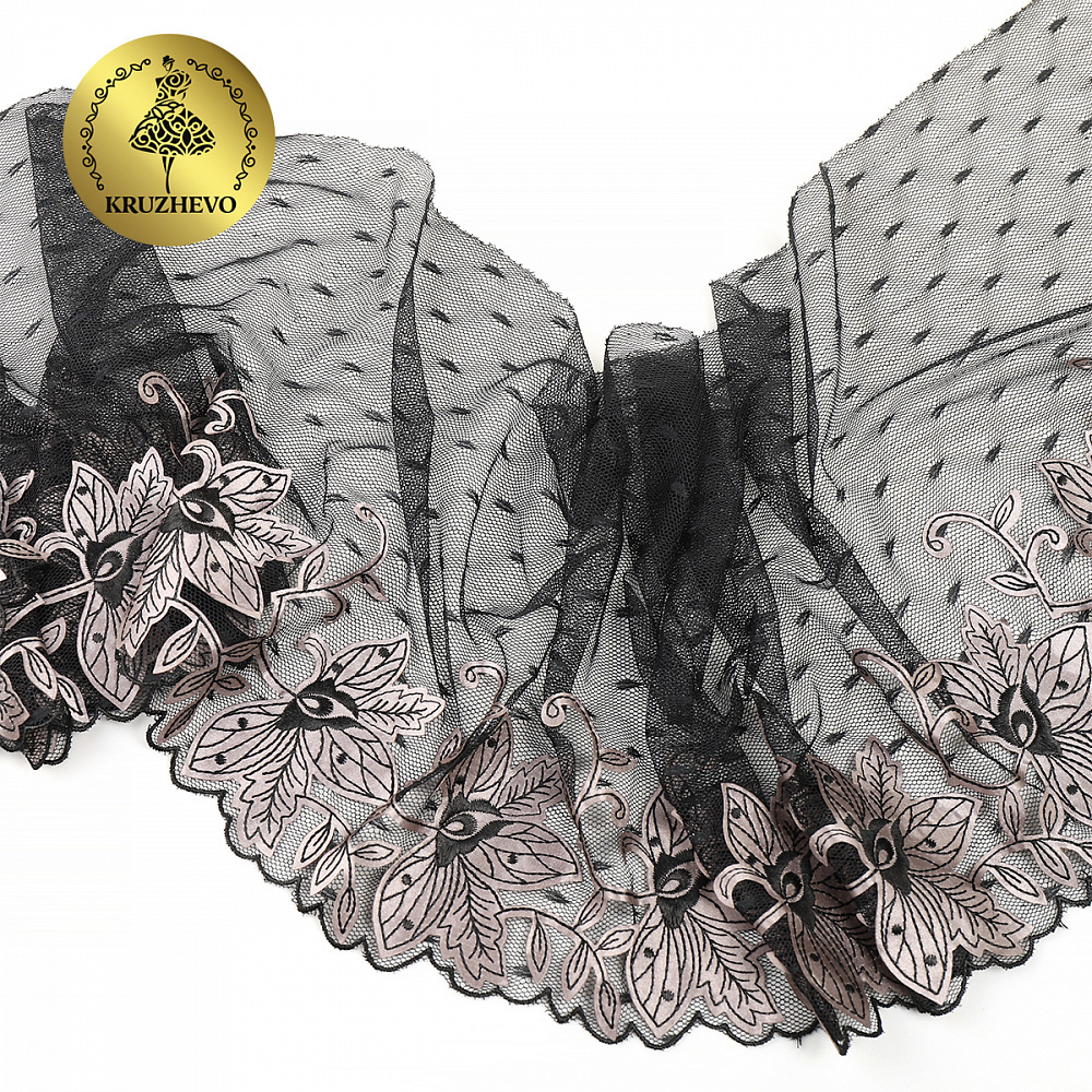 Кружево на сетке широкое 205 мм, диз.OG43, цв.черный, левая, 6м, Kruzhevo