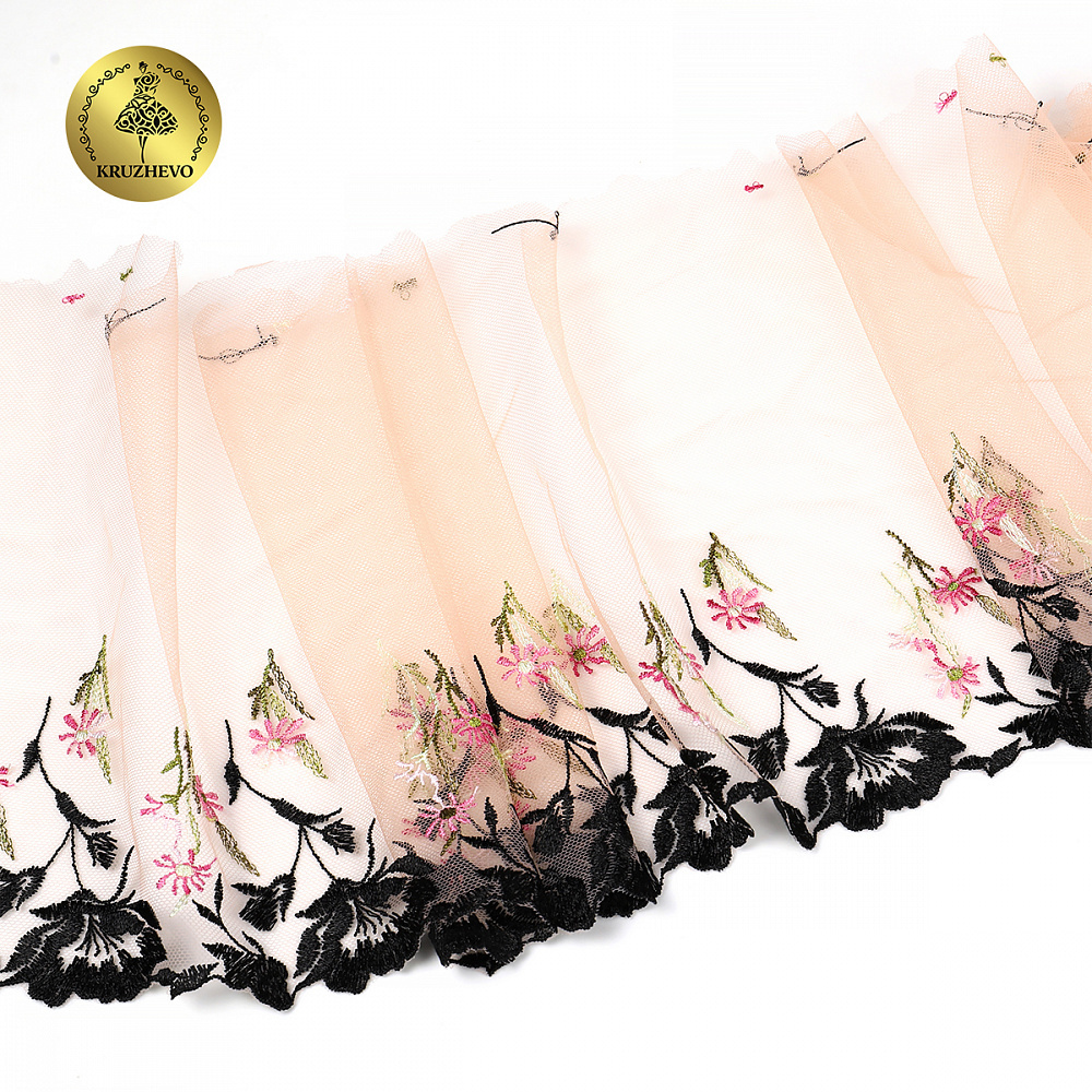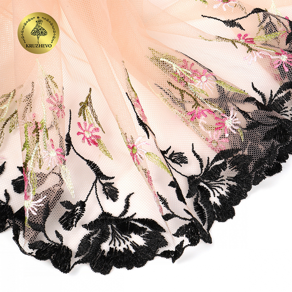 Очень нежное и приятное кружево вышивка на сетке. Сеточка мягкая, приятная на ощупь, хорошо драпируется. Вышивка выполнена очень аккуратно. Идеально для отделки нижнего белья, одежды, текстиля.