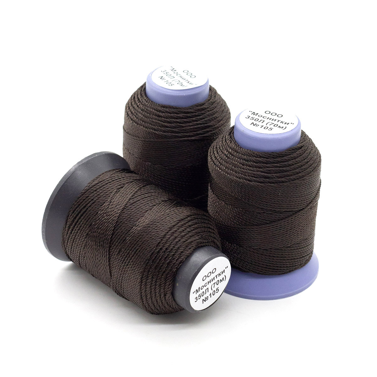 Лавсановые нитки 350Л изготовлены из комплексных полиэфирных нитей, обладающих малой усадкой. Очень прочные, не вытягиваются, устойчивы к различным многократным нагрузкам. Лавсановые нитки используют при пошиве изделий с повышенными требованиями к износостойкости: – обуви, сумок, кожгалантереи; – снаряжения и амуниции; – спецодежды; – кожаной обивки для мягкой мебели или салонов автомобилей; – спортивной одежды из материалов с малой усадкой. Линейная плотность: 367 текс. Разрывная нагрузка: 16 кгс.