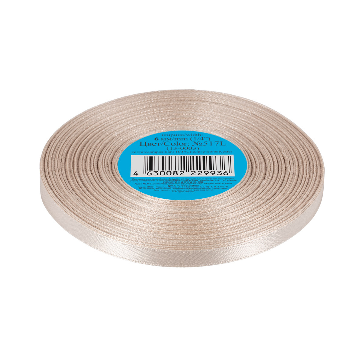 Лента атласная 1-сторонняя 6.0 мм / 33±2 метра, №517L(13-0003) кремовый, Gamma