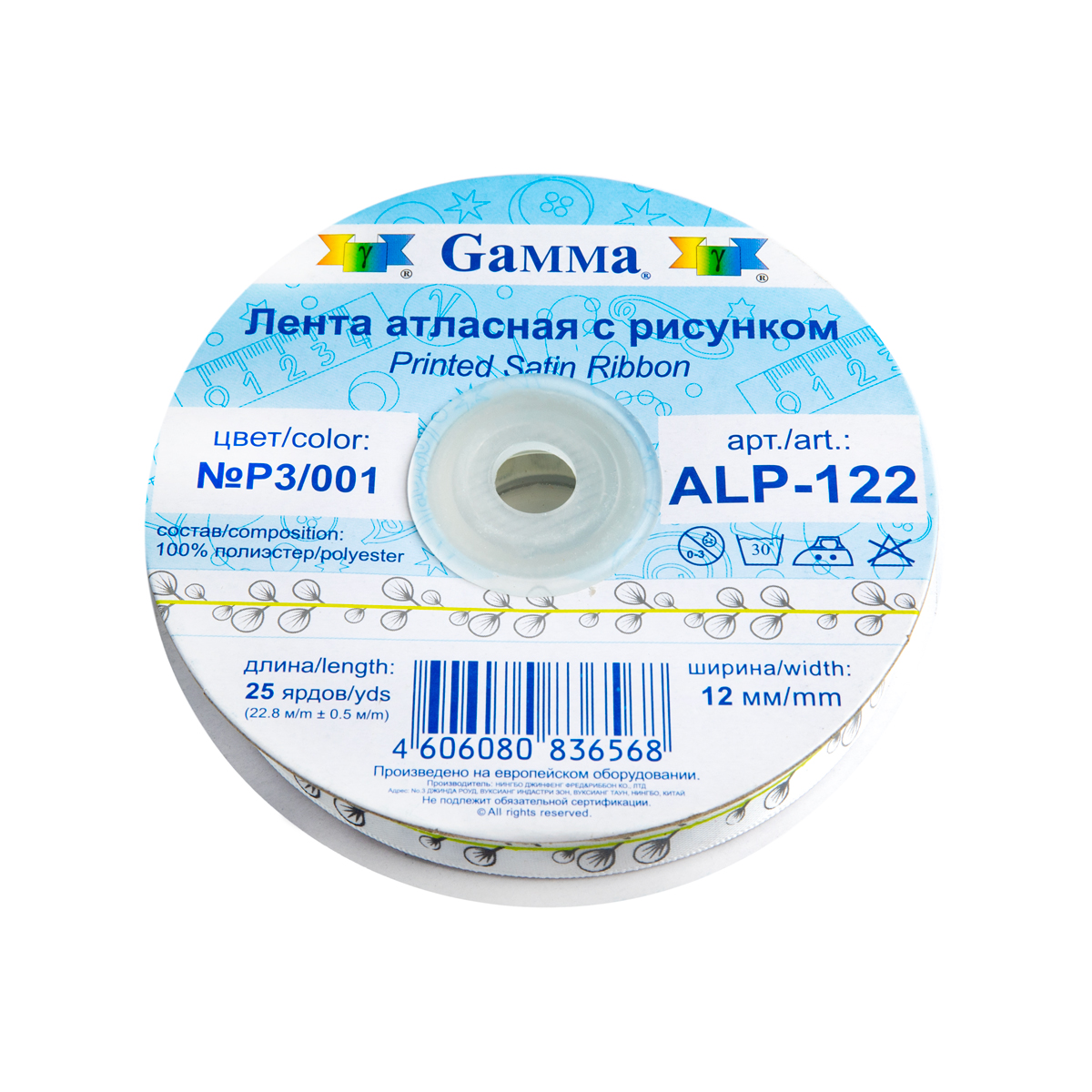 Лента атласная с рисунком 12.0 мм / 22.8 метров, P3/001 листочки/белый, Gamma ALP-122