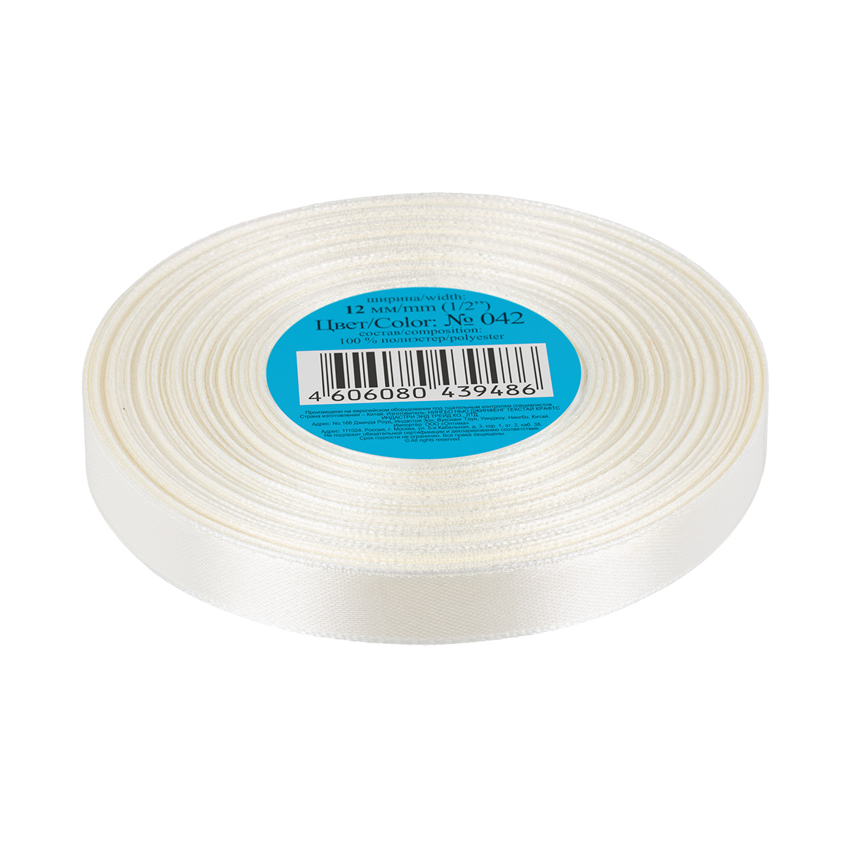 Лента атласная 1-сторонняя 12.0 мм / 33±2 метра, №042 молочный, в термоплёнке, Gamma