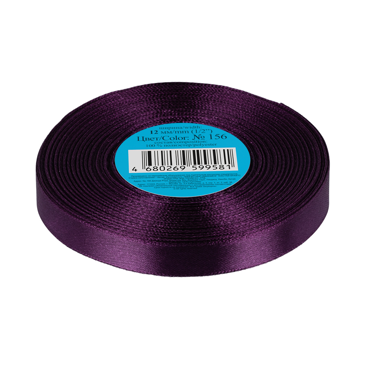 Лента атласная 1-сторонняя 12.0 мм / 33±2 метра, №156 т.фиолетовый, в термоплёнке, Gamma