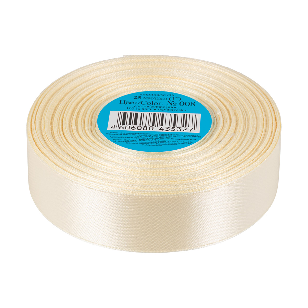 Лента атласная 1-сторонняя 25.0 мм / 33±2 метра, №008 кремовый, в термоплёнке, Gamma