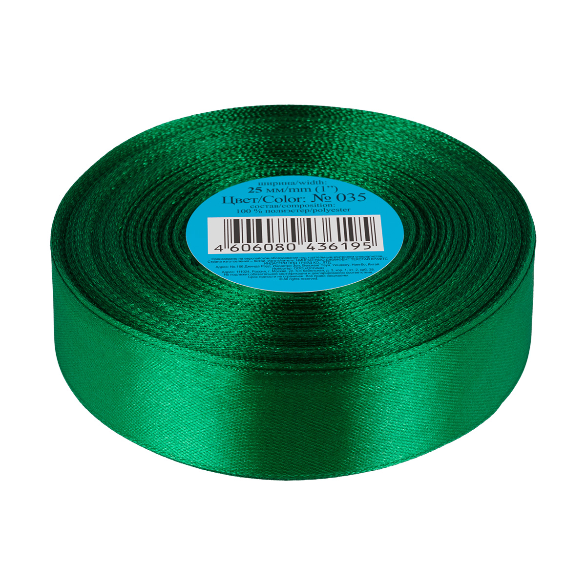 Лента атласная 1-сторонняя 25.0 мм / 33±2 метра, №035 зеленый, в термоплёнке, Gamma