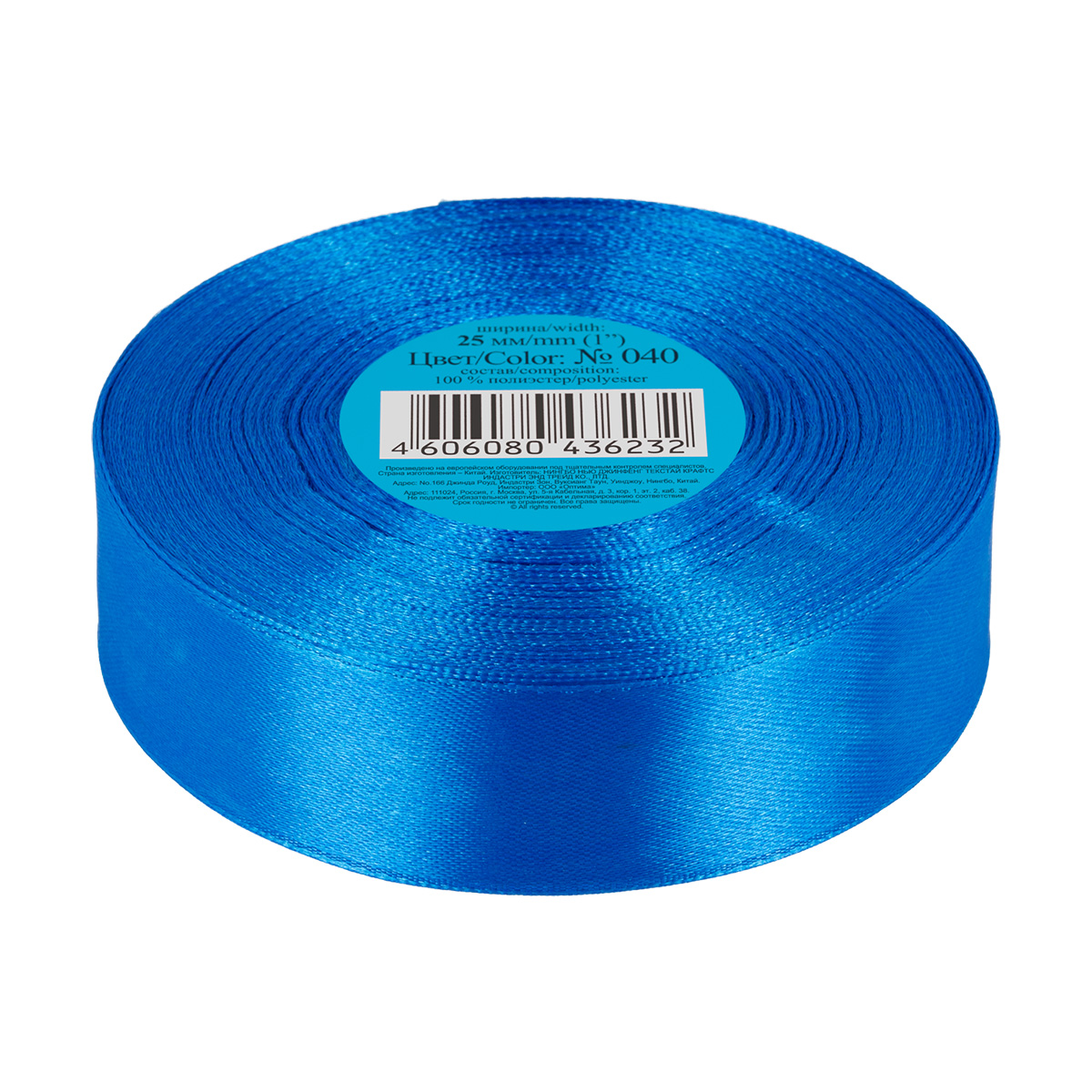 Лента атласная 1-сторонняя 25.0 мм / 33±2 метра, №040 синий, в термоплёнке, Gamma
