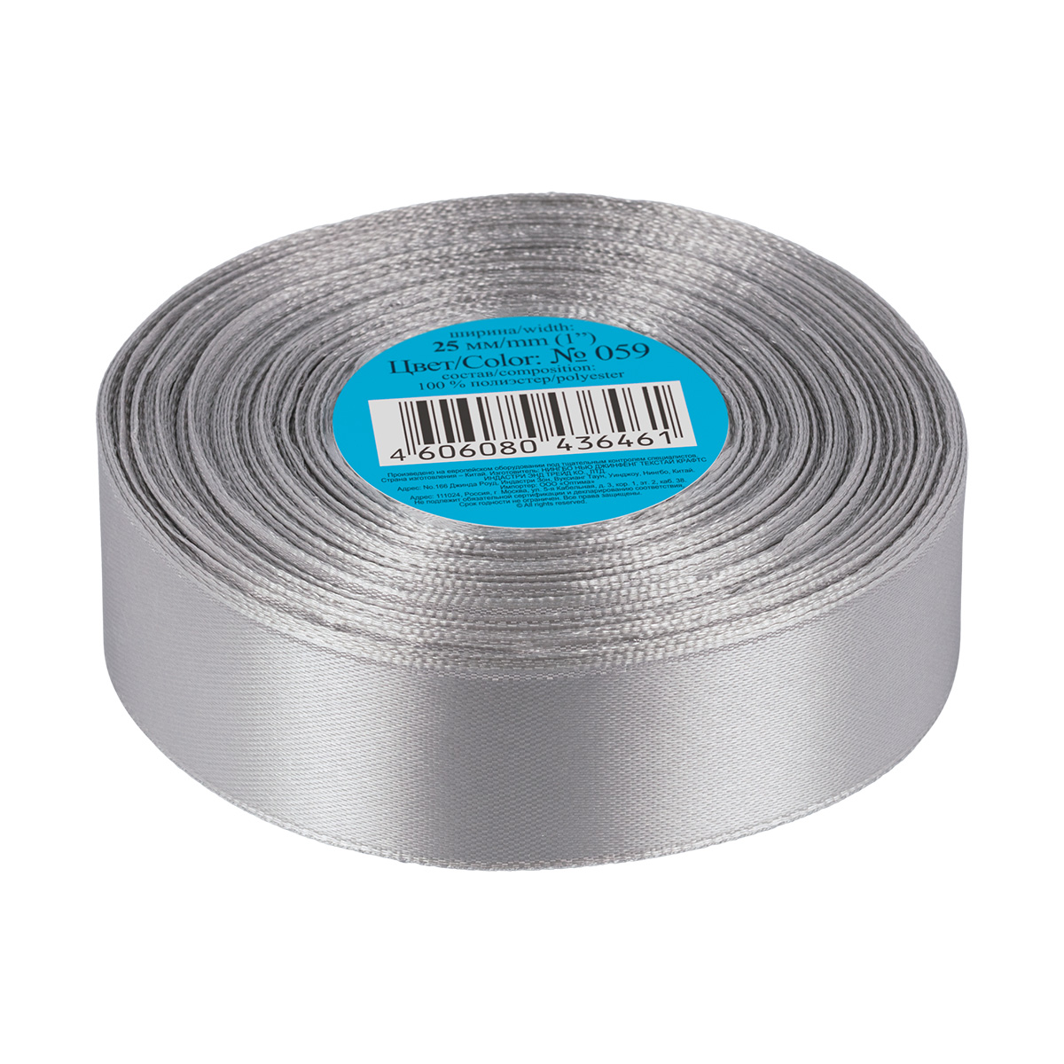 Лента атласная 1-сторонняя 25.0 мм / 33±2 метра, №059 серый, в термоплёнке, Gamma