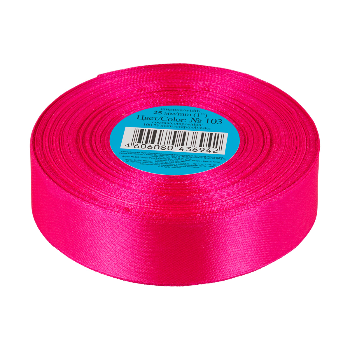 Лента атласная 1-сторонняя 25.0 мм / 33±2 метра, №103 малиновый, в термоплёнке, Gamma