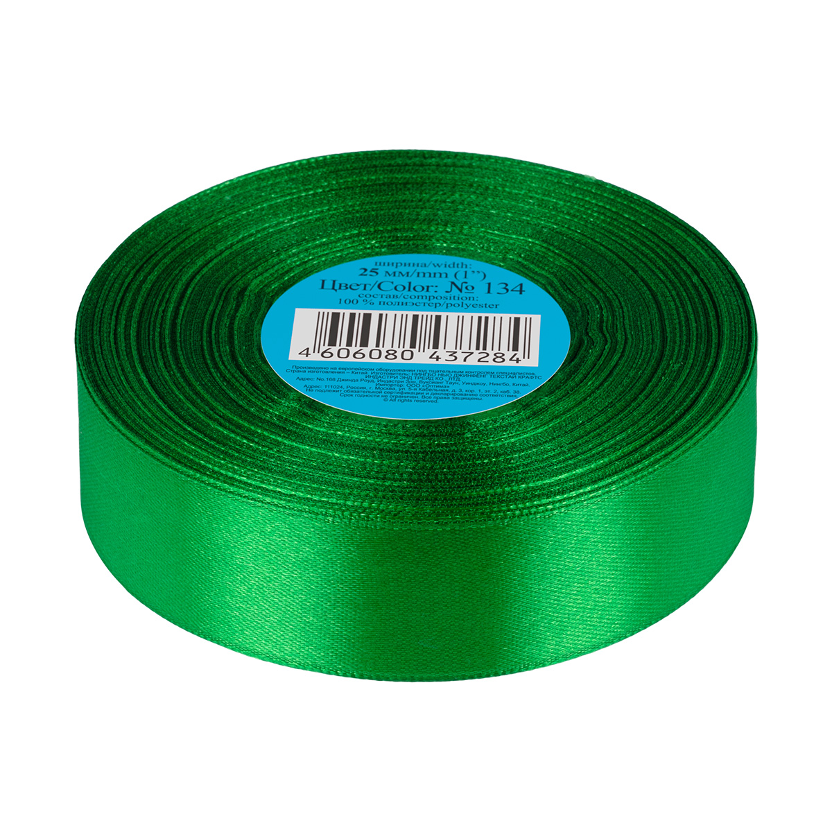 Лента атласная 1-сторонняя 25.0 мм / 33±2 метра, №134 зеленый, в термоплёнке, Gamma