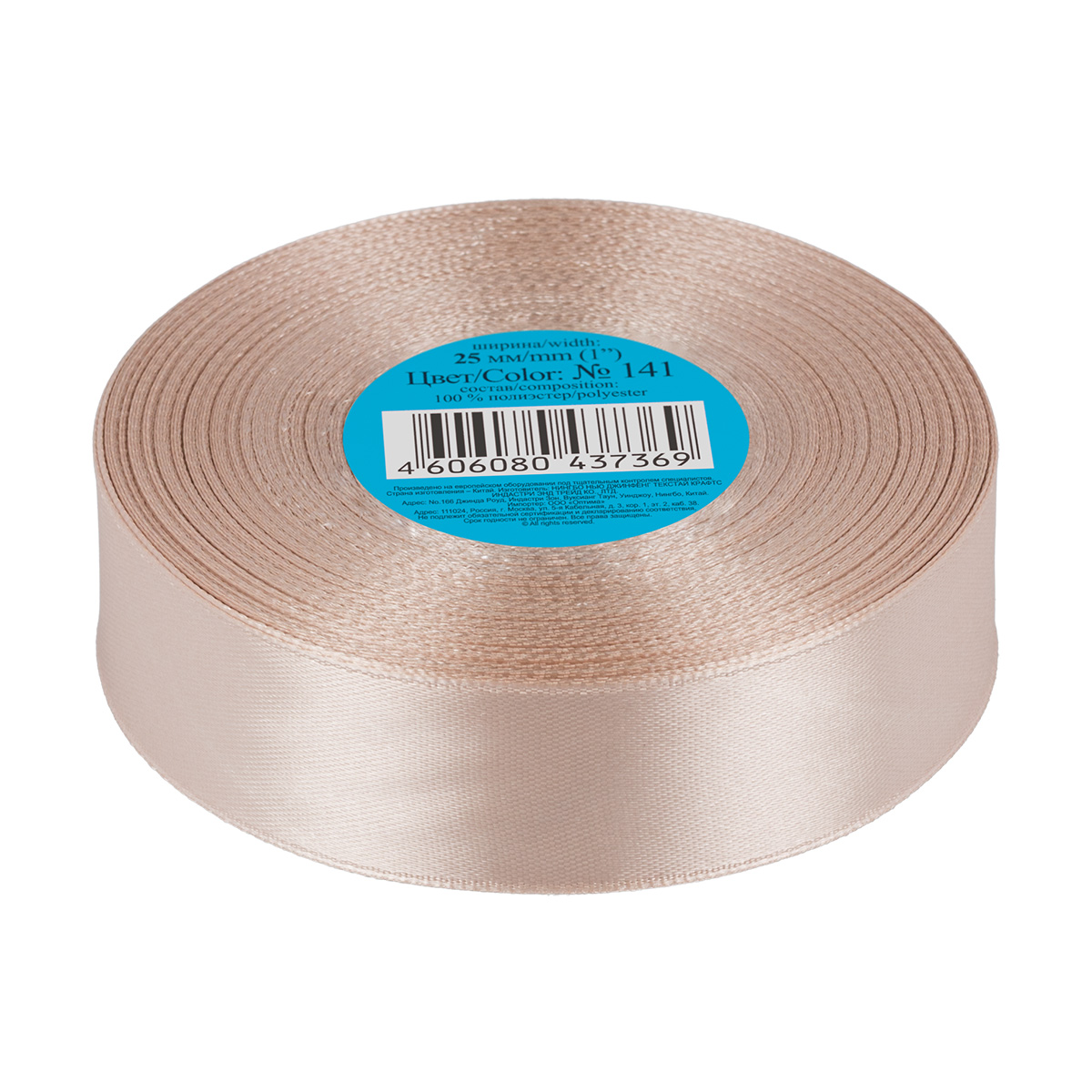 Лента атласная 1-сторонняя 25.0 мм / 33±2 метра, №141 бежевый, в термоплёнке, Gamma